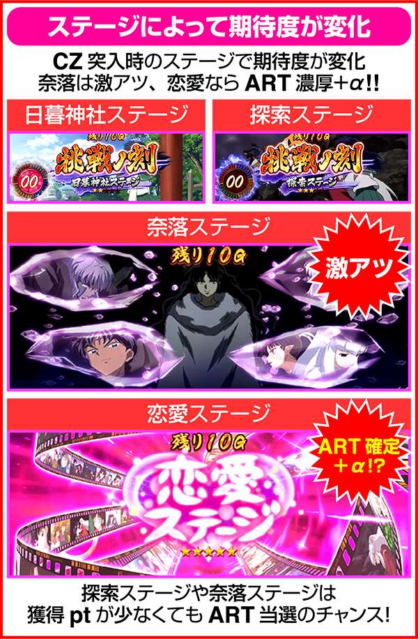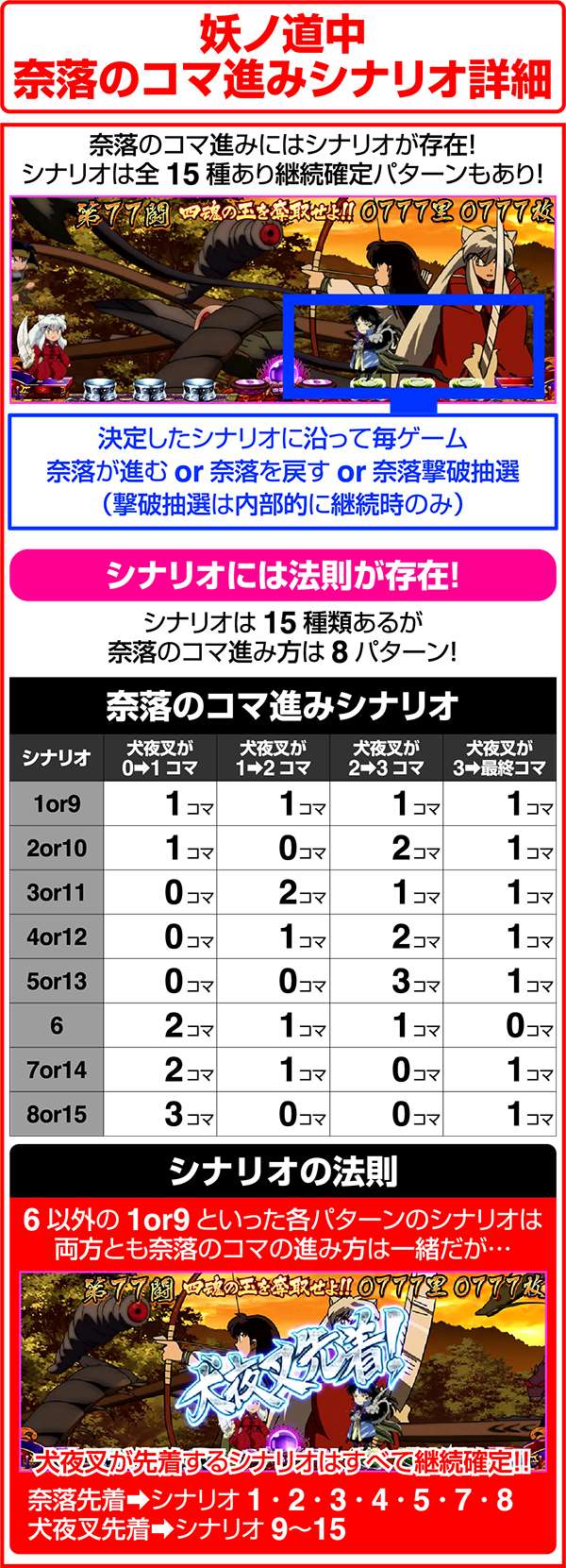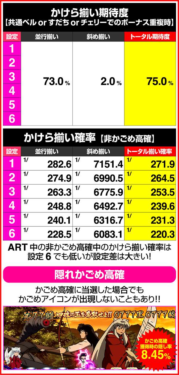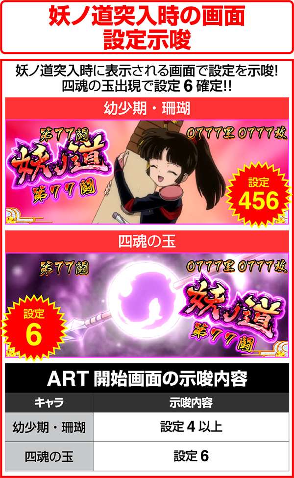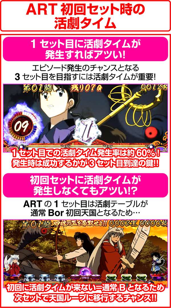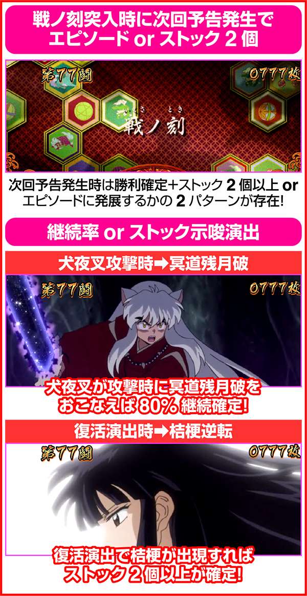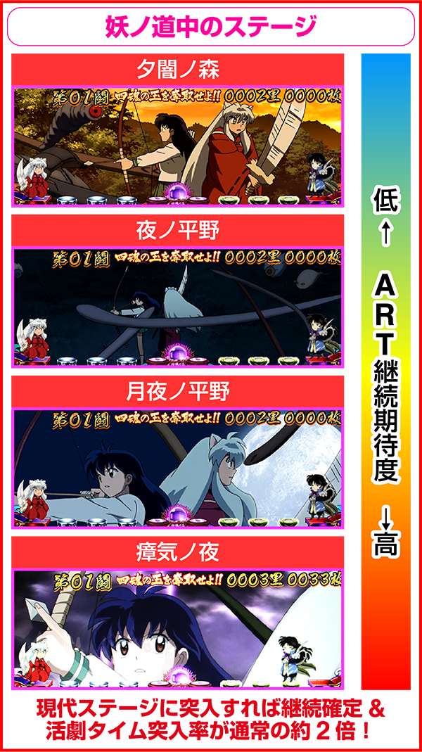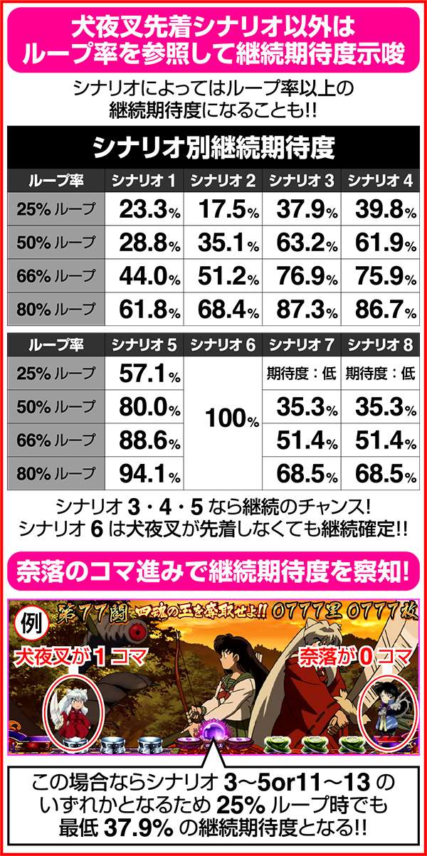 犬夜叉と奈落がどのコマにいるかでシナリオを絞ることが可能。犬夜叉が1コマ目、奈落が0コマ目ならシナリオ3〜5or11〜13が確定するため、ARTがどのループ率でも平均値を上回る継続期待度となる。