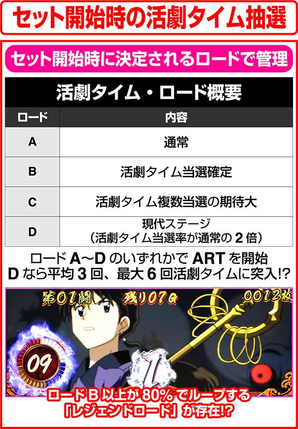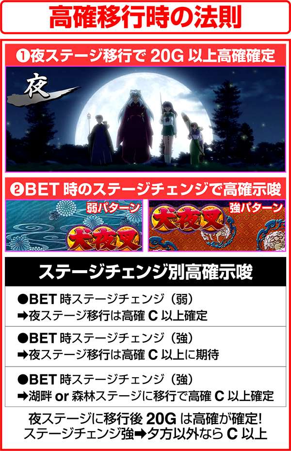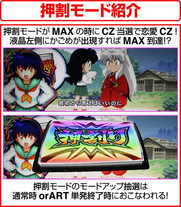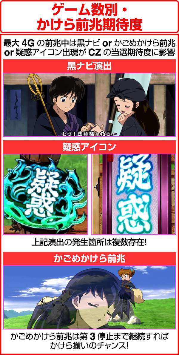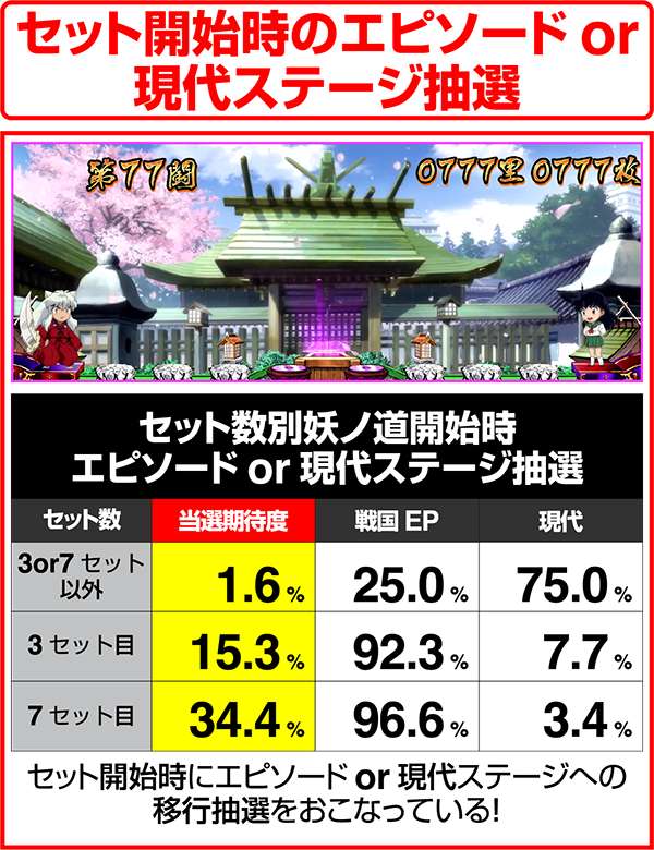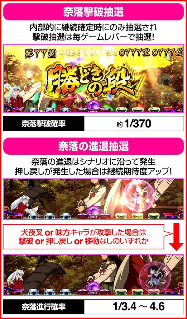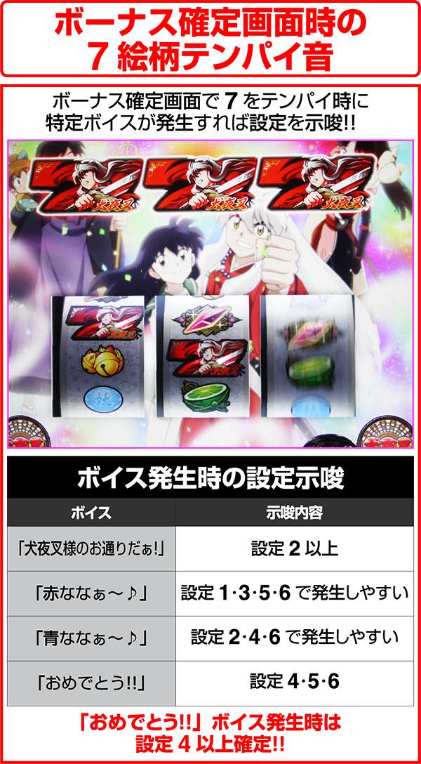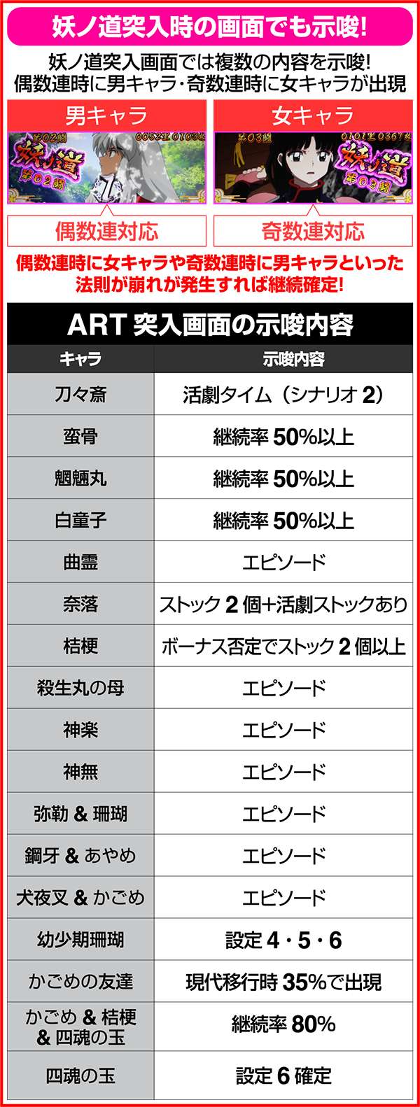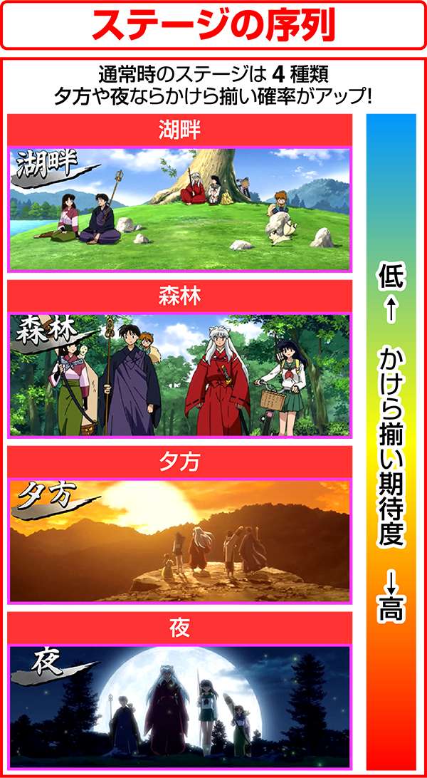 犬夜叉と奈落がどのコマにいるかでシナリオを絞ることが可能。犬夜叉が1コマ目、奈落が0コマ目ならシナリオ3〜5or11〜13が確定するため、ARTがどのループ率でも平均値を上回る継続期待度となる。