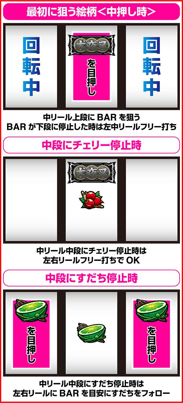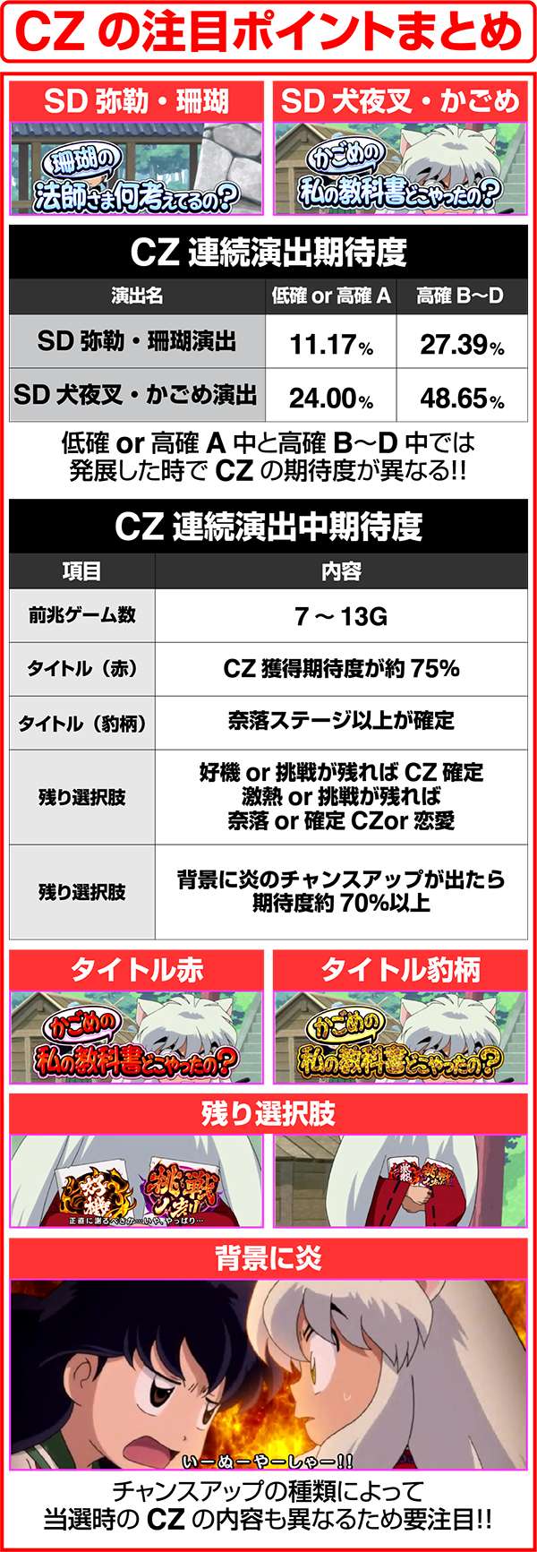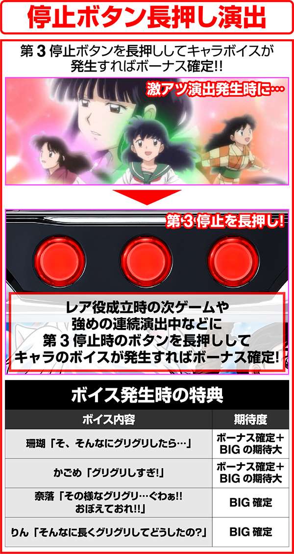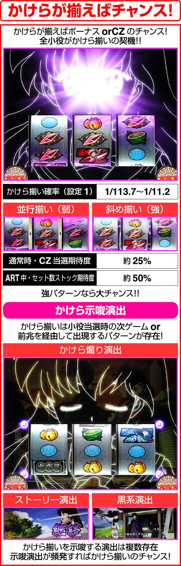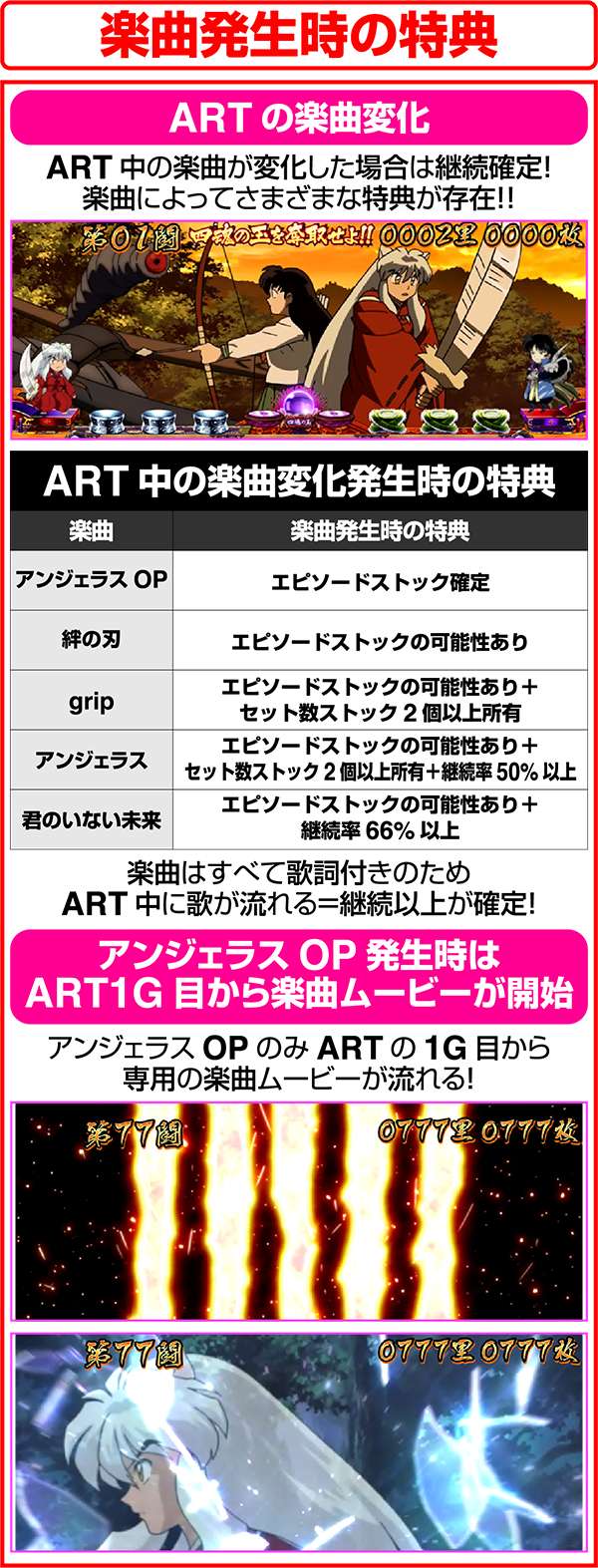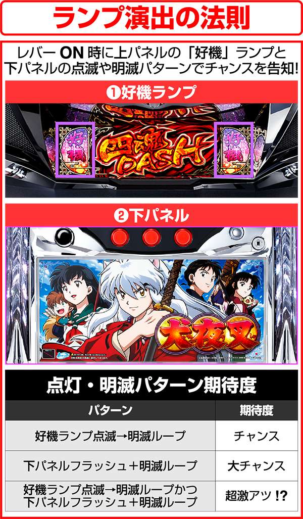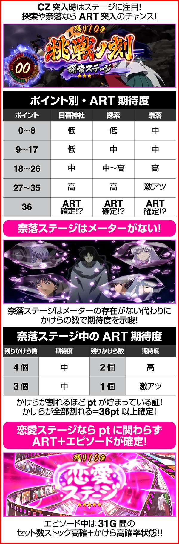 犬夜叉と奈落がどのコマにいるかでシナリオを絞ることが可能。犬夜叉が1コマ目、奈落が0コマ目ならシナリオ3〜5or11〜13が確定するため、ARTがどのループ率でも平均値を上回る継続期待度となる。