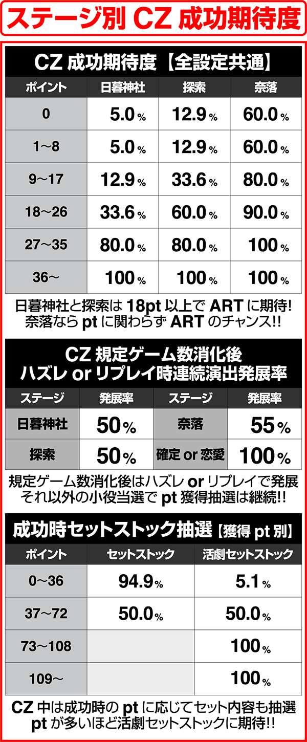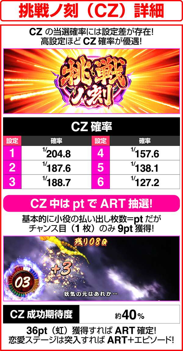 CZは最大で36ptを獲得できればART確定。ptはリプレイ以外の小役を引くと獲得でき、pt数は小役の払い出し枚数に対応している。レア役当選時は次ゲームから2G間CZのゲーム数減算がストップし、獲得ptが2or4倍となる。また、CZ終了後は連続演出に突入し、獲得したptが多いほど連続演出成功の期待度が上昇する。