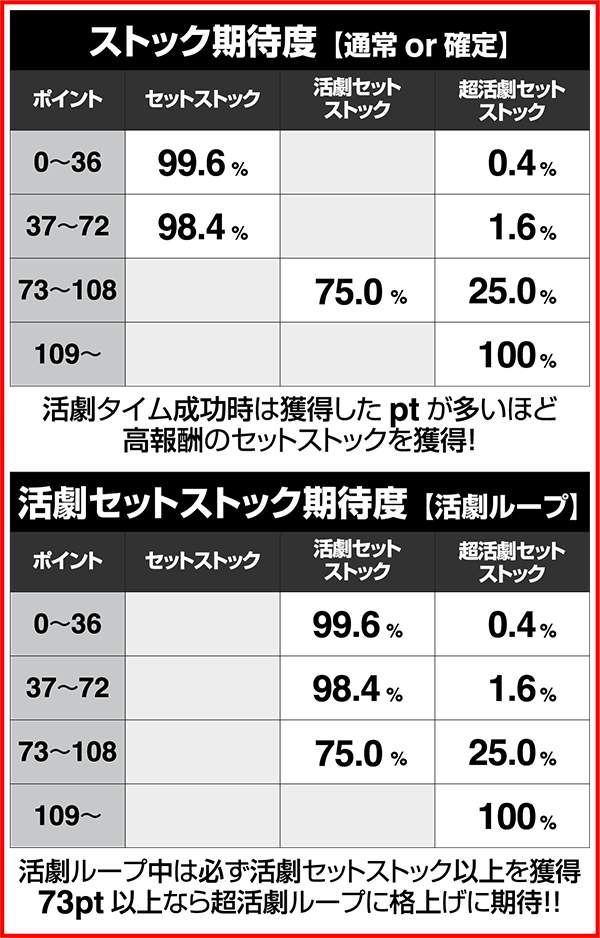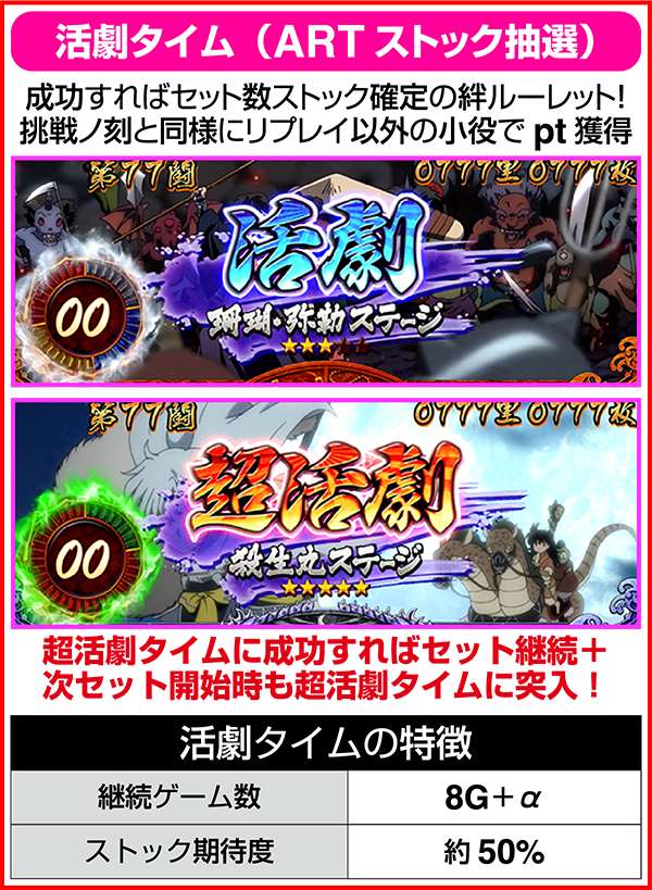 活劇タイムに成功すればセットストック以上が確定する。また、活劇セットストック中(活劇ループ)の活劇タイムに成功した場合は、必ず活劇セット以上が確定する。また、活劇ループ中の活劇タイムで高ptを獲得できれば、超活劇セットストック(超活劇ループ)に格上げされる。