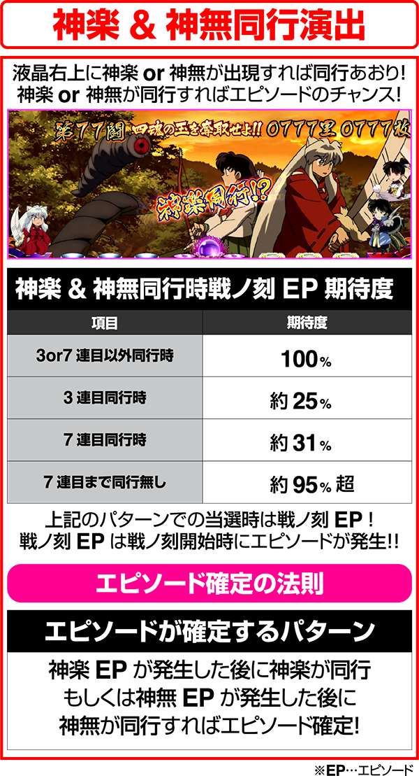 妖ノ道突入時に液晶右上に神楽or神無が出現すれば同行あおりとなる。同行すれば、エピソード獲得のチャンスとなり、3セット目と7セット目なら同行する可能性が高くなっている。