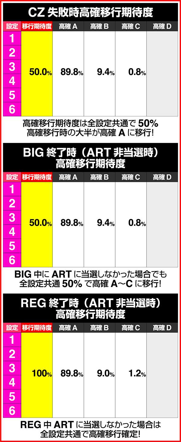 また、確定CZの突入契機はCZのスルー回数(ART間で6回目のCZに当選すれば確定CZ)となる。