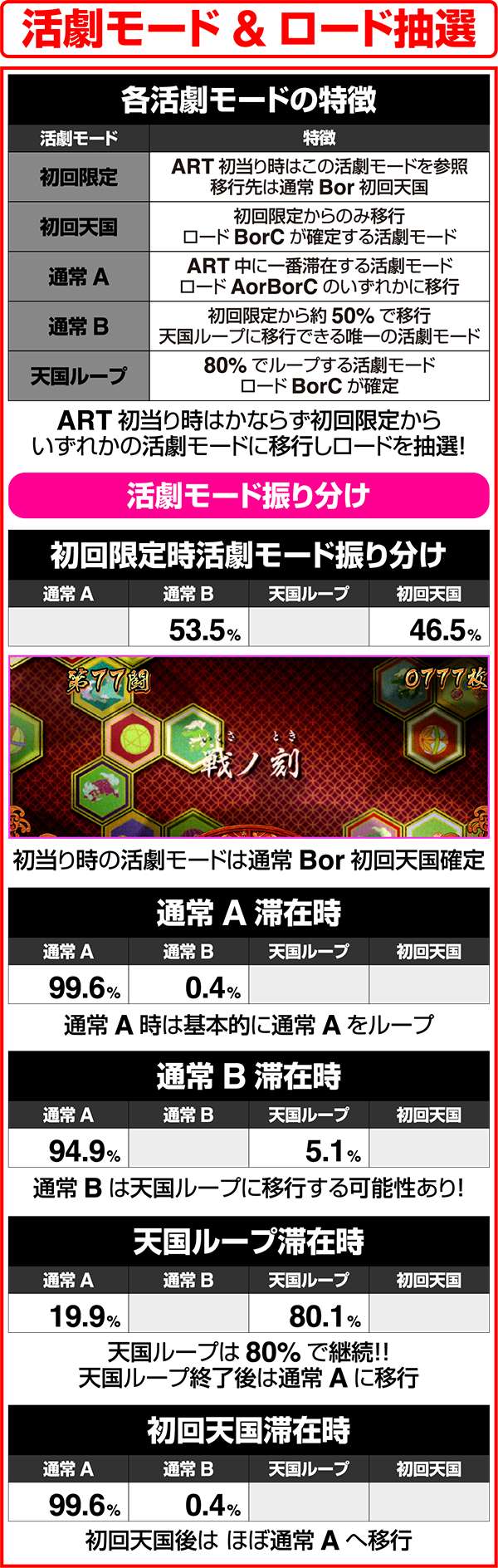 また、1セット目に活劇タイムが発生しない=通常Bが確定。通常Bのセットを継続できれば天国ループに移行するチャンスとなるので、ボーナスや継続抽選での継続に期待しよう。