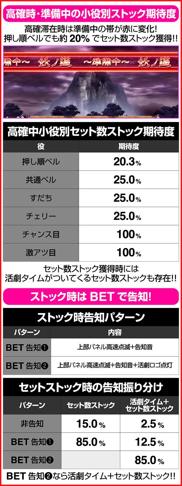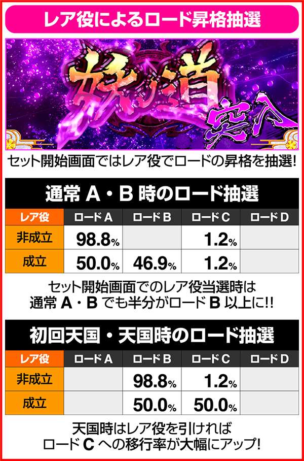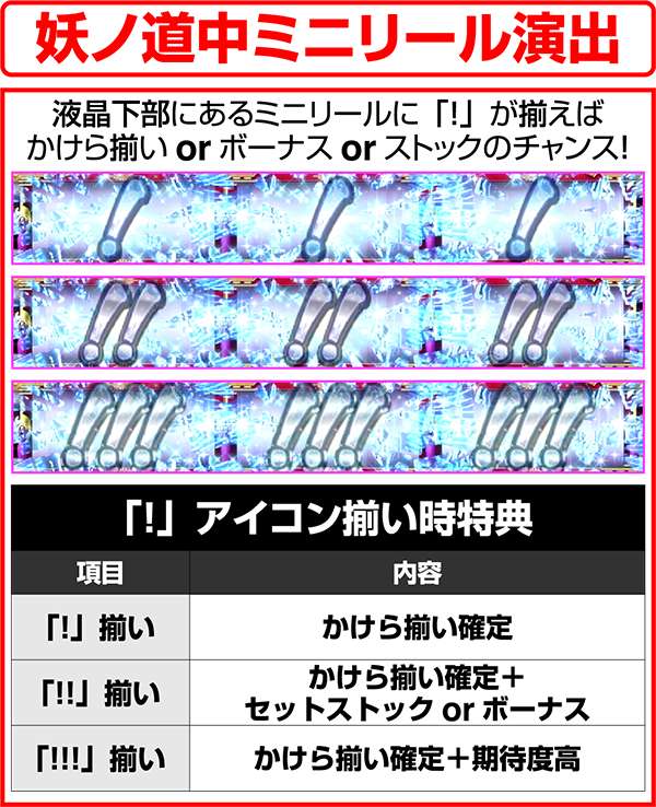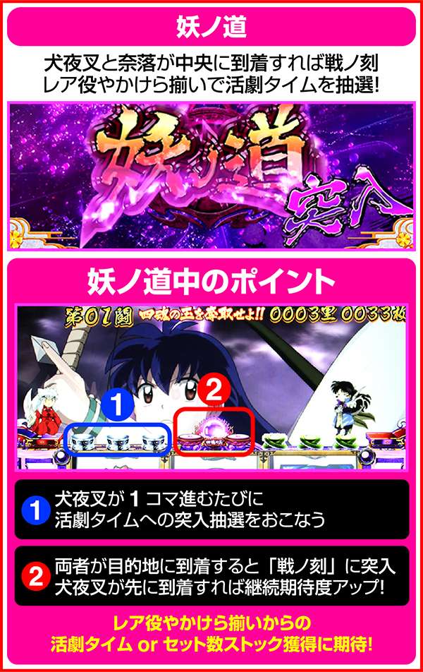 妖ノ道中は犬夜叉と奈落が中央に到着するまで継続。レア役orかけら揃いで活劇タイムやセット数上乗せの抽選をおこなっている。また、ボーナスはリアルボーナスだけに、ART中ももちろん抽選されている。