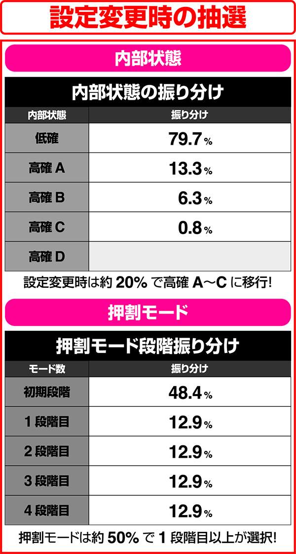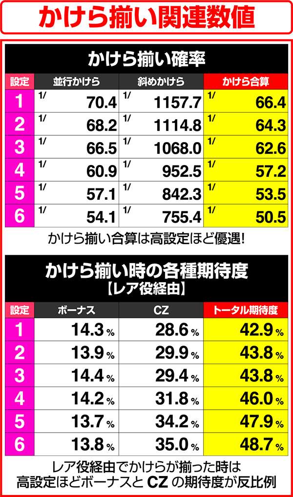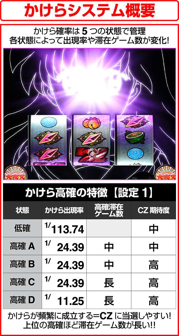 かけらの出現確率は5つの状態で管理されており、低確以外なら24分の1以上でかけらが出現する。とくに、高確D移行時はCZのループ率が80%にもなるため、ART突入の大チャンスとなる。