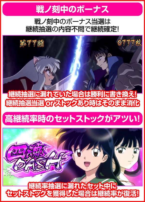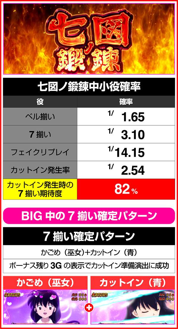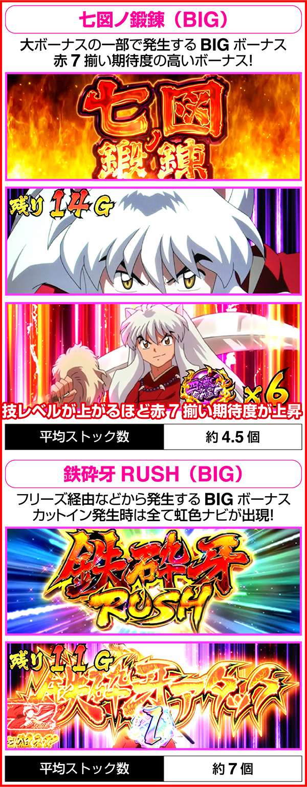 どちらも獲得枚数は通常のBIGと同様に204枚。七図ノ鍛錬中は犬夜叉の技レベルが高いほどストック期待度がアップ。技レベルは5段階(白<青<黄<緑<赤)あり、背景の色に対応している。鉄砕牙RUSHは七図ノ鍛錬よりも強力で、赤7ナビが出現した時は必ず虹色ナビが発生し赤7揃いが確定する。