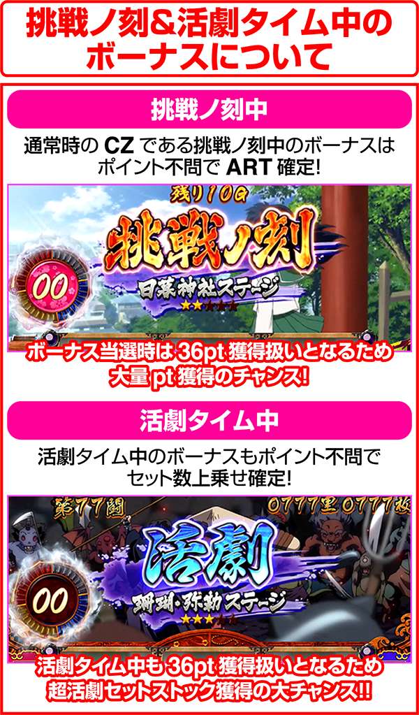 挑戦ノ刻と活劇タイムはどちらも36pt以上獲得すれば成功となる。滞在中のボーナスは36pt獲得となるため、成功確定。レア役当選後の2倍や4倍時にボーナスに当選すれば36pt×2or4倍といった大量ptを獲得できるチャンスだ。