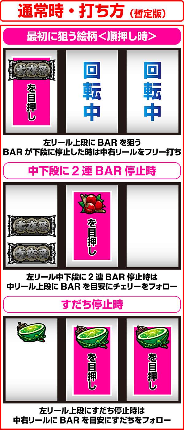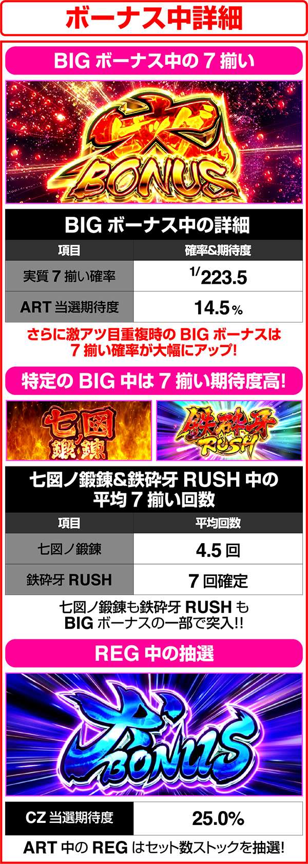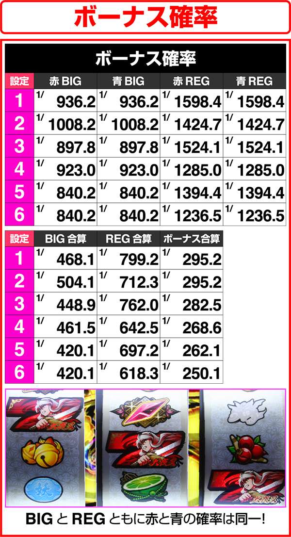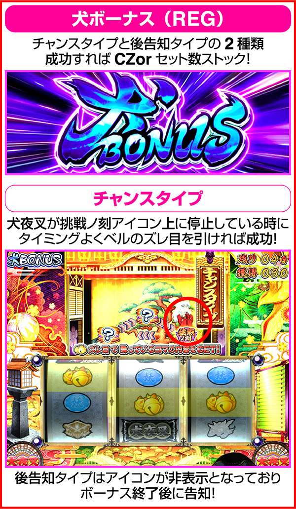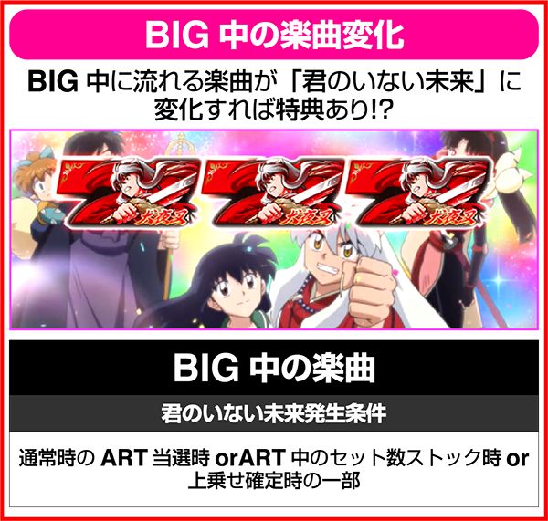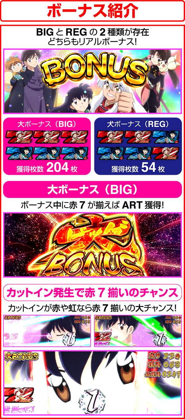 通常時におけるボーナスはBIGならARTの初当り、REGならCZを抽選。ART中はともにセット数ストックの抽選をおこなう。BIGは大ボーナスがメインとなるが、「七図ノ鍛錬」や「鉄砕牙RUSH」といった赤7揃い高確率のボーナスに変わることがある。どちらも、ARTのストックを高確率で獲得できるため、突入時は大量出玉のトリガーとなるだろう。
