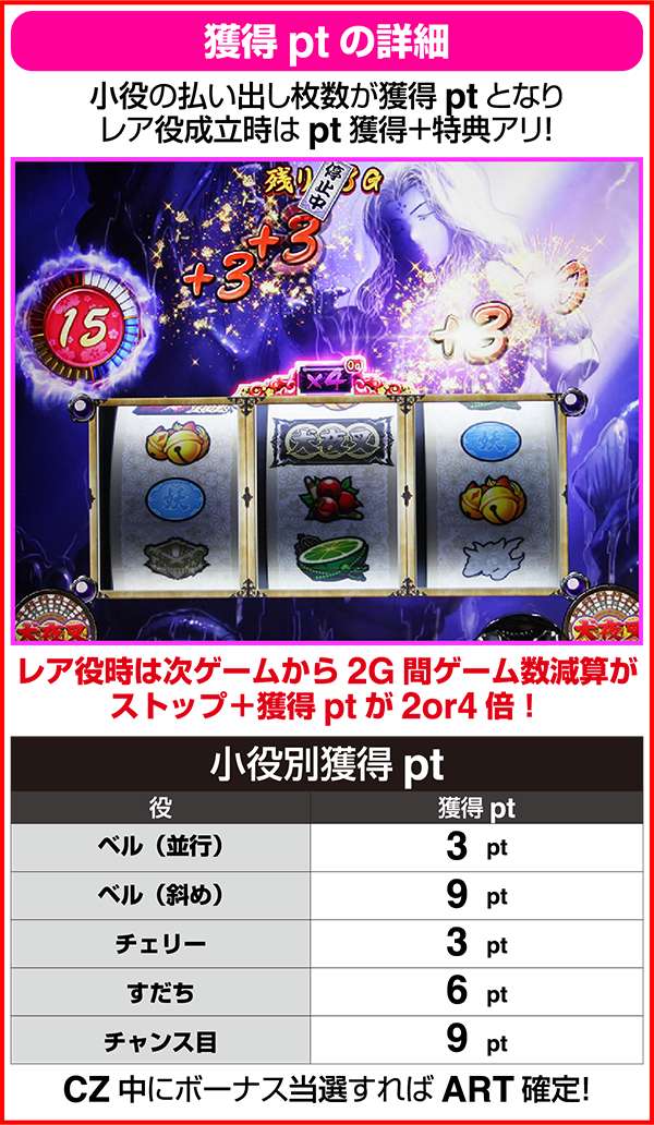 CZ中のpt獲得方法は払い出しのある小役に当選すること。基本的に払い出し枚数=ptとなるが、チャンス目(払い出しは1枚)の場合のみ9pt獲得できる。
