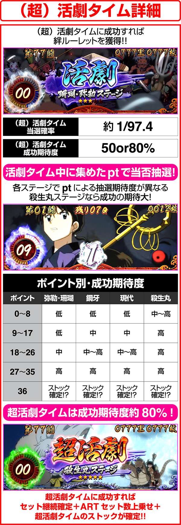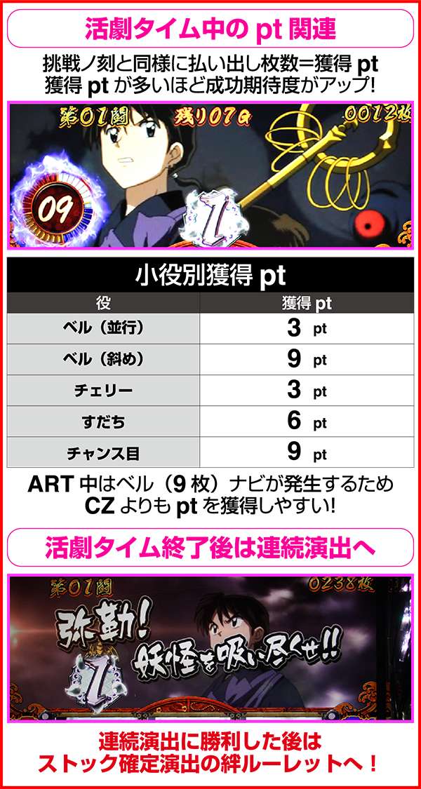 活劇タイム中は通常時の挑戦ノ刻と同様の流れで、払い出しのある小役を引くことでptを獲得し、獲得したptに応じて絆ルーレットの抽選をおこなう。活劇タイムにもステージがあり、殺生丸(超活劇タイム)なら成功率は約80%。成功時の絆ルーレットでは、必ずセット数上乗せ+超活劇タイムのストックが80%でループするため、一度突入すればARTの高継続に期待できる。