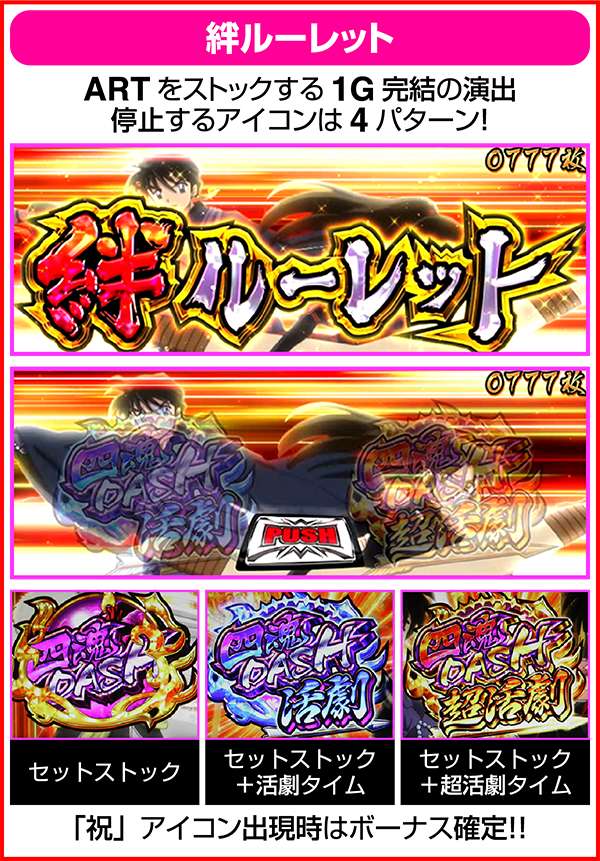 絆ルーレットは1G完結となっており、ARTのセット数を獲得する演出。獲得できるストックのアイコンは3パターンあり、四魂DASHor四魂DASH+活劇タイムor四魂DASH+超活劇タイムのいずれかとなる。祝アイコン出現時はボーナス確定となり、絆ルーレットは終了する。