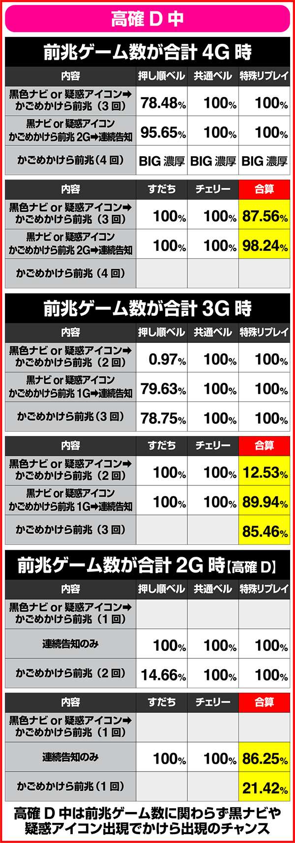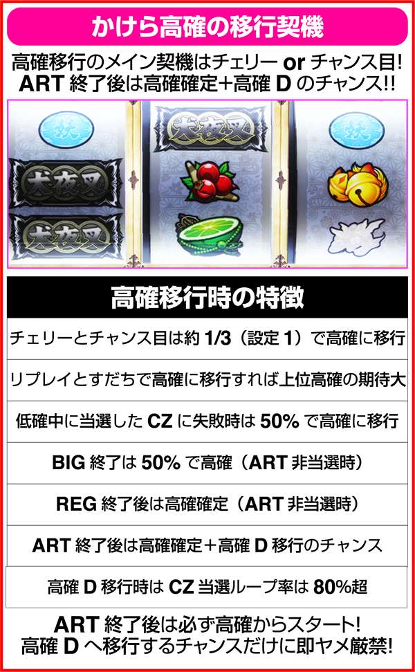 高確D中のすだちorチェリーで、黒ナビor疑惑アイコン→かごめかけら前兆3回ならかけら確定となる。また、高確D中なら全体的に、ベルや特殊リプレイなどからも、かけら揃いに十分期待が持てる。