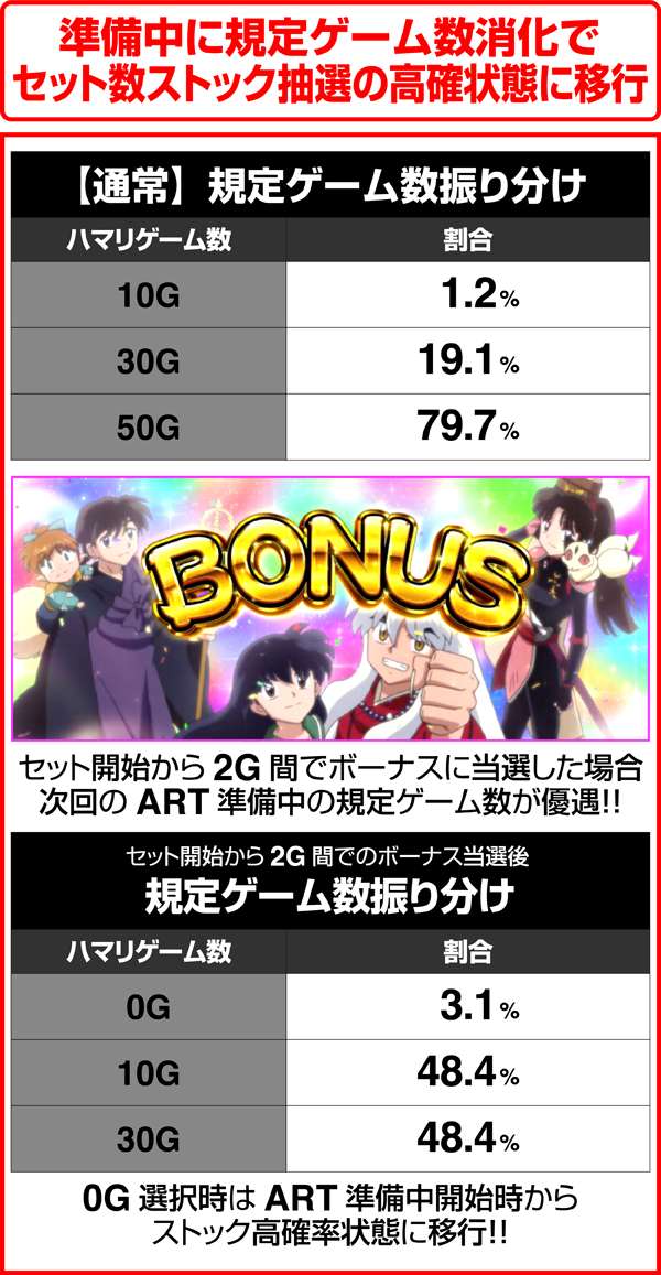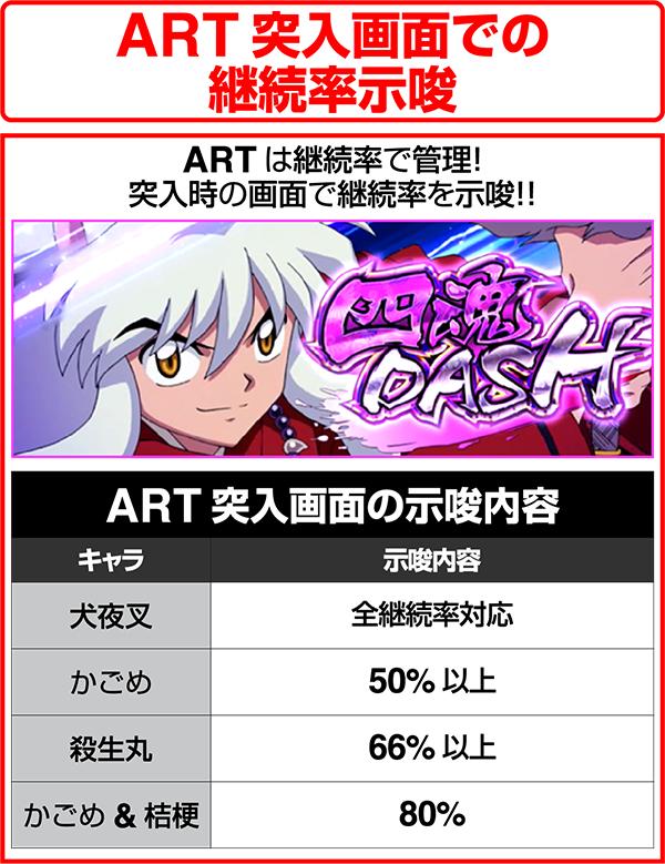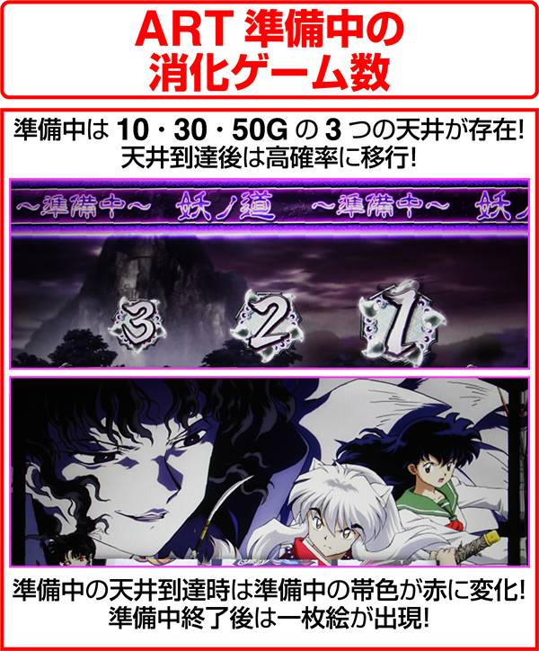 ART準備中には最大で50Gの天井ゲーム数が存在し、到達すれば高確率に移行する。天井到達後は「準備中」の帯色が赤に変化。さらに、天井到達後の準備終了後は一枚絵が出現。一枚絵がかごめと犬夜叉の2人バージョンなら複数のストックを所持していることが濃厚となる。