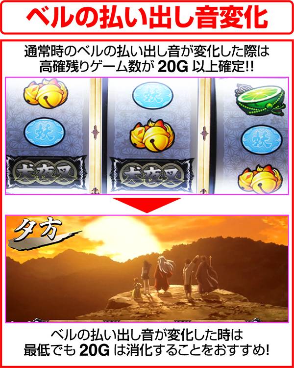 通常時のベルの払い出し音が変化すれば高確A以上に滞在していることが確定。また、20G以上高確が残っているため、変化した場合は即ヤメは厳禁といえる。