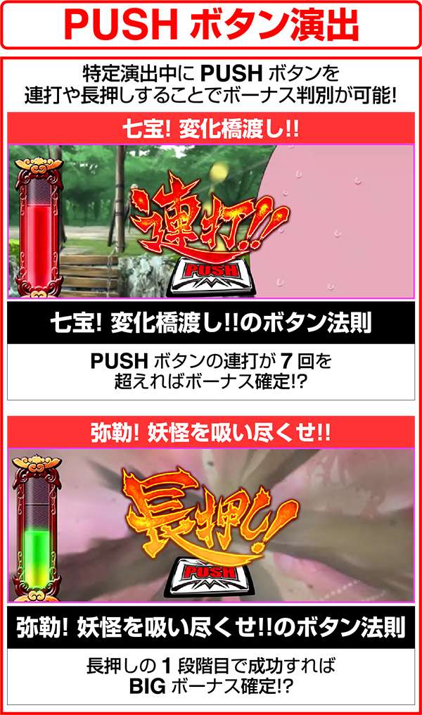 通常時に発生する連続演出の「七宝! 変化橋渡し!!」では、演出中にPUSHボタン連打の演出が発生する。その時に、ボタンを7回以上押しても演出が終了しなければボーナスが確定。ほかにも、ART中の連続演出である「弥勒! 妖怪を吸い尽くせ!!」では、PUSHボタンを長押しして、1段階目で成功すればBIGボーナスが確定する。