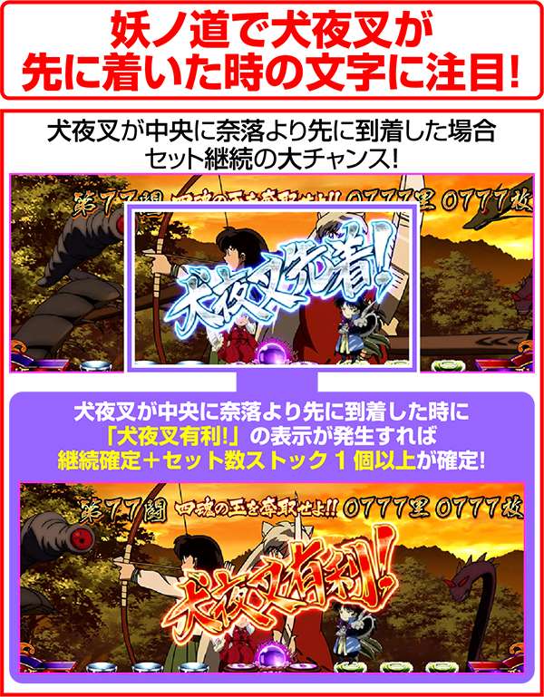 妖ノ道中の犬夜叉と奈落が中央に集まる時に、犬夜叉が奈落より先に中央に到着すれば、セット継続の大チャンス。「犬夜叉有利!」の文字が出現すれば、セット継続+ARTのセット数を1個以上所有していることが確定する。