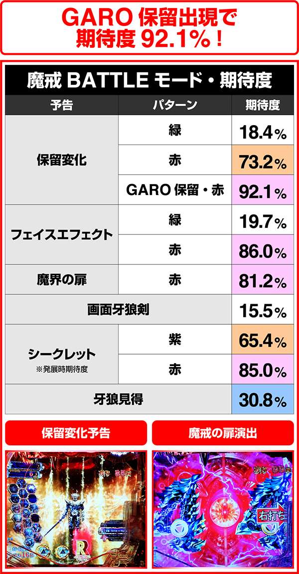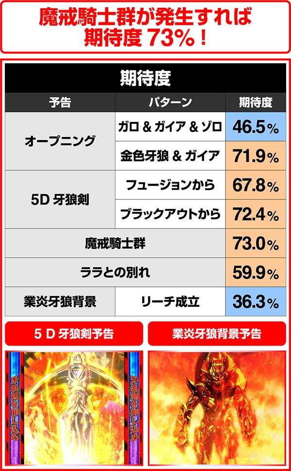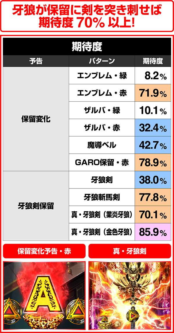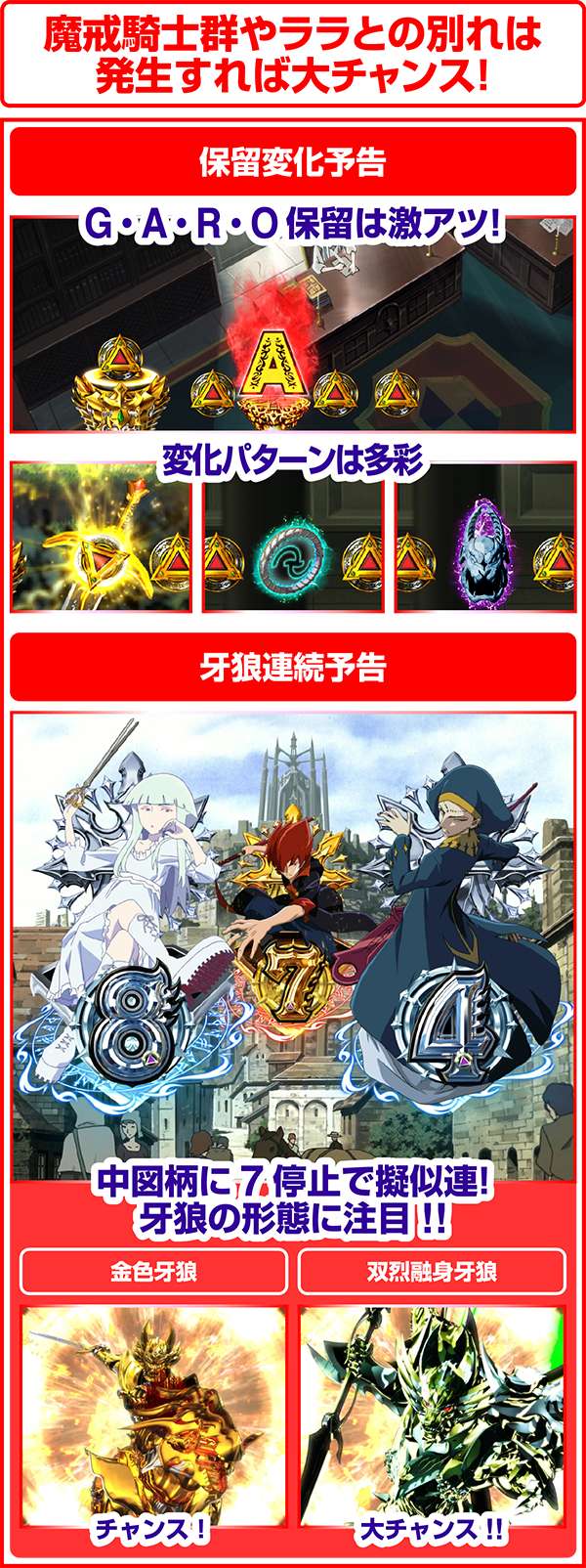 保留変化予告はおなじみのG・A・R・O保留や牙狼剣の出現に期待。
