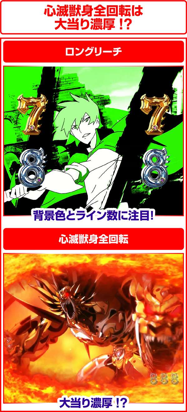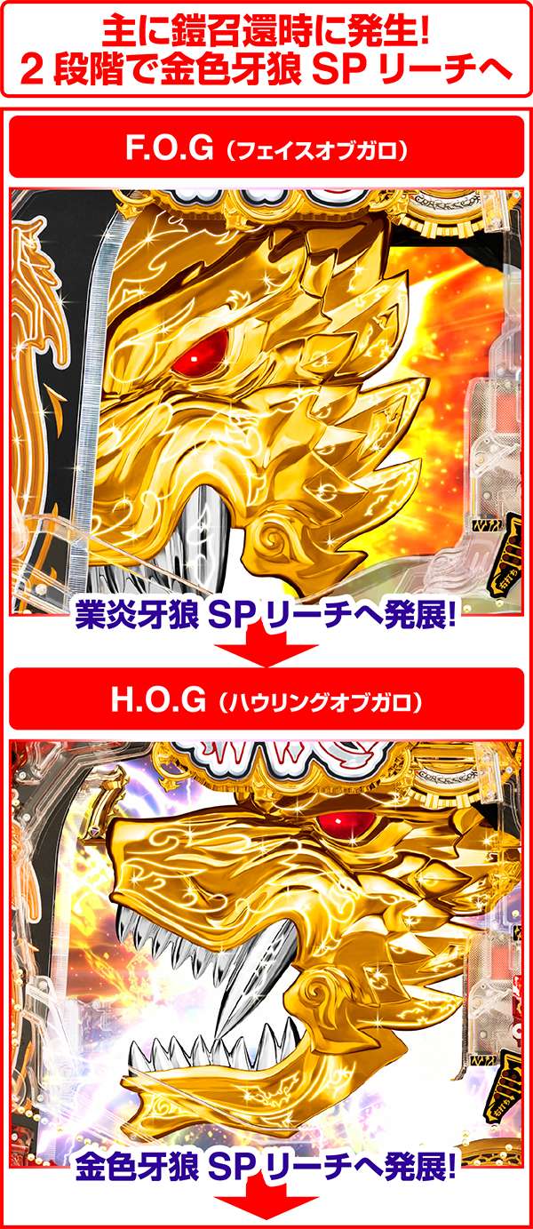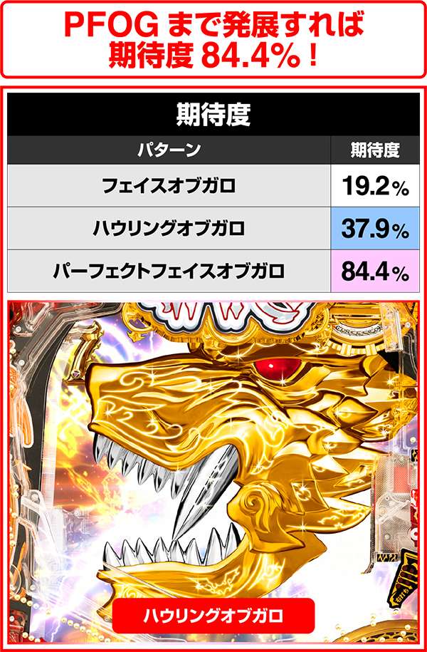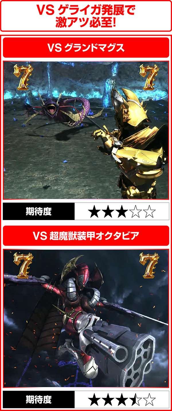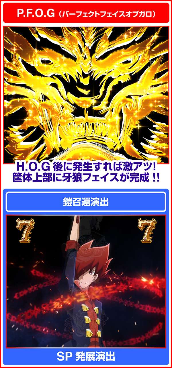 鎧召還演出時に二段階変形役モノが出現するとチャンス。H.O.Gまで変形すれば大チャンスとなり、さらにH.O.G後にP.F.O.Gが発生すれば激アツ!