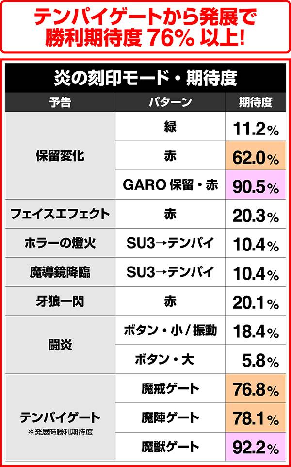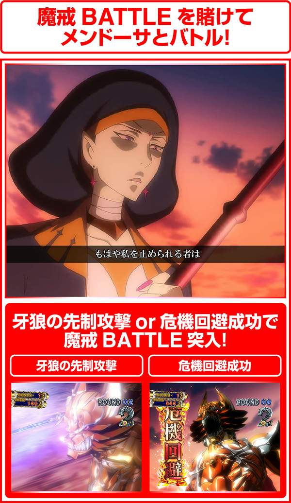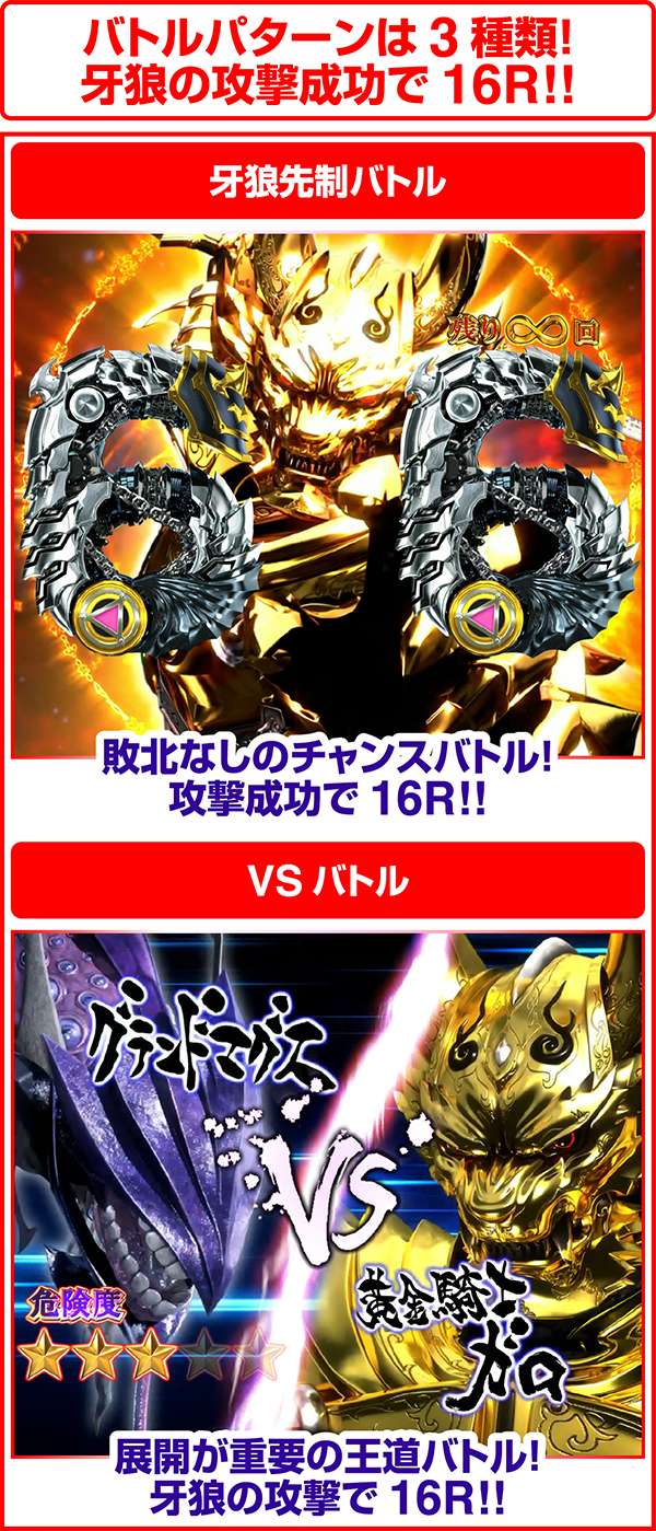 牙狼の先制攻撃or危機回避成功で魔戒BATTLEに突入。敗北時は時短or確変の魔導兵器モードに突入する。