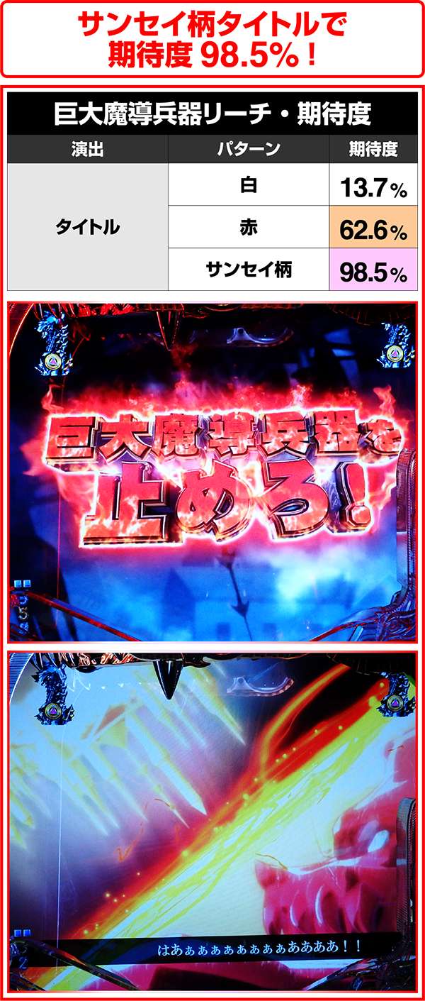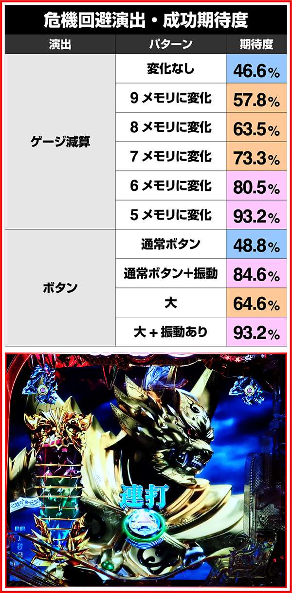 危機回避演出は連打の前にゲージのメモリが減算することがあり、5メモリまで減ると成功期待度93.2%と激アツ。