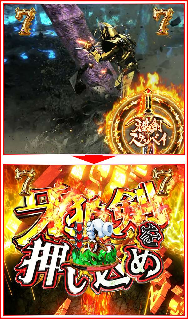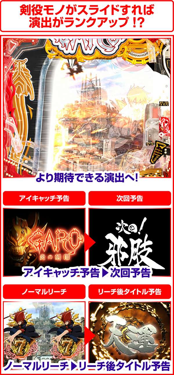 アイキャッチ予告やノーマルリーチ中に剣役モノが作動すれば、より期待できる演出にランクアップ!