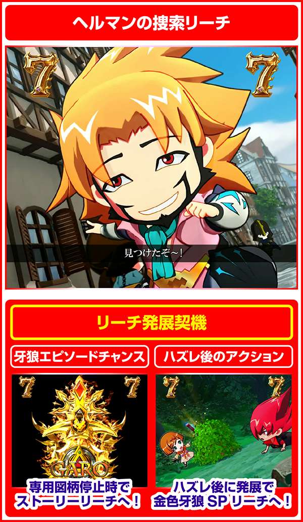 牙狼シリーズでおなじみのハズレ後の発展だけでなく、専用図柄停止からのストーリーリーチへ発展するパターンを新たに追加。