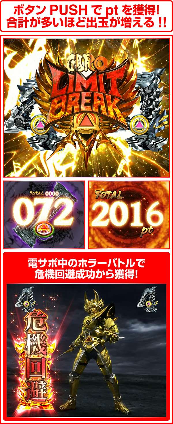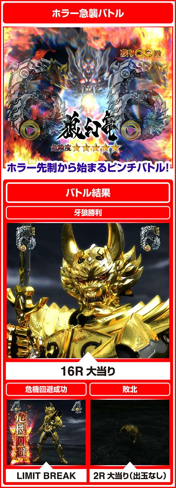危機回避成功から獲得できるLIMIT BREAKは確変大当りとなるため、ラウンド消化後に突入する魔戒BATTLEモードは内部的に確変だ!