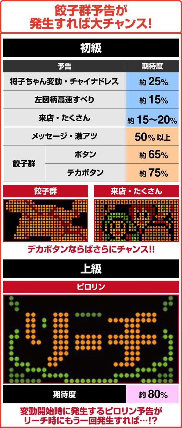 初級モードで発生する餃子群は通常ボタンからの発生でもアツいが、デカボタン経由ならば、さらに期待度はアップ!!