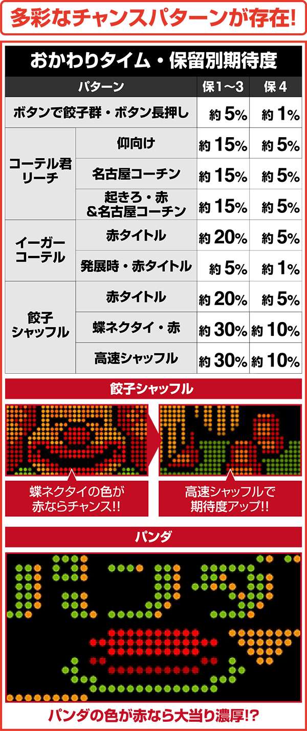 また、パンダモードが出現時にタイトル文字やパンダが赤など、大当り濃厚パターンも存在する。