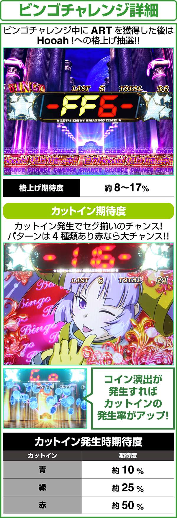 ビンゴチャレンジ中のセグ揃い(ART当選)にはチャンスアップとして、コイン演出とカットイン演出がある。コイン演出発生時はカットインの発生率がアップするのでチャンスとなっている。