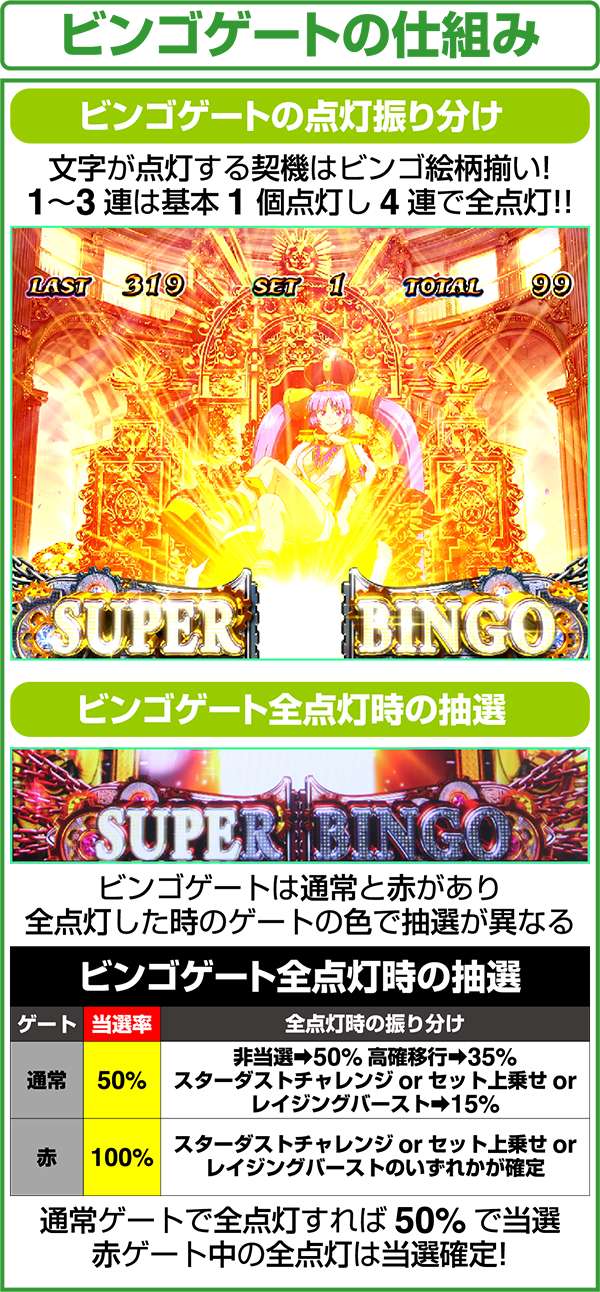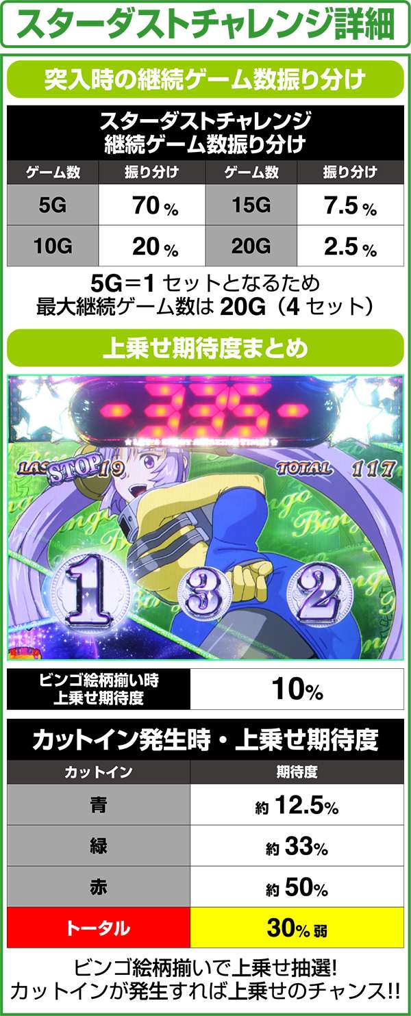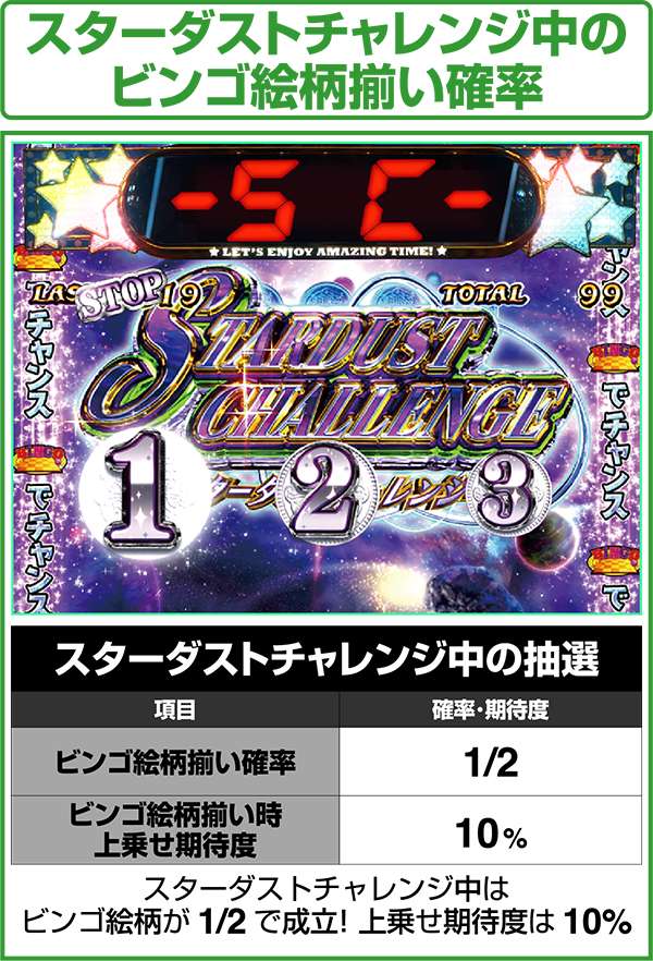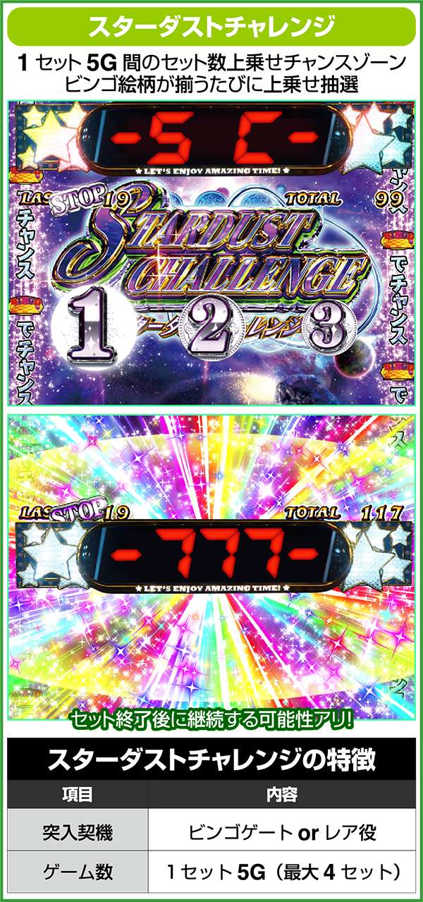 スターダストチャレンジは、1セット5G継続し、ビンゴ揃いをするたびに上乗せ抽選。