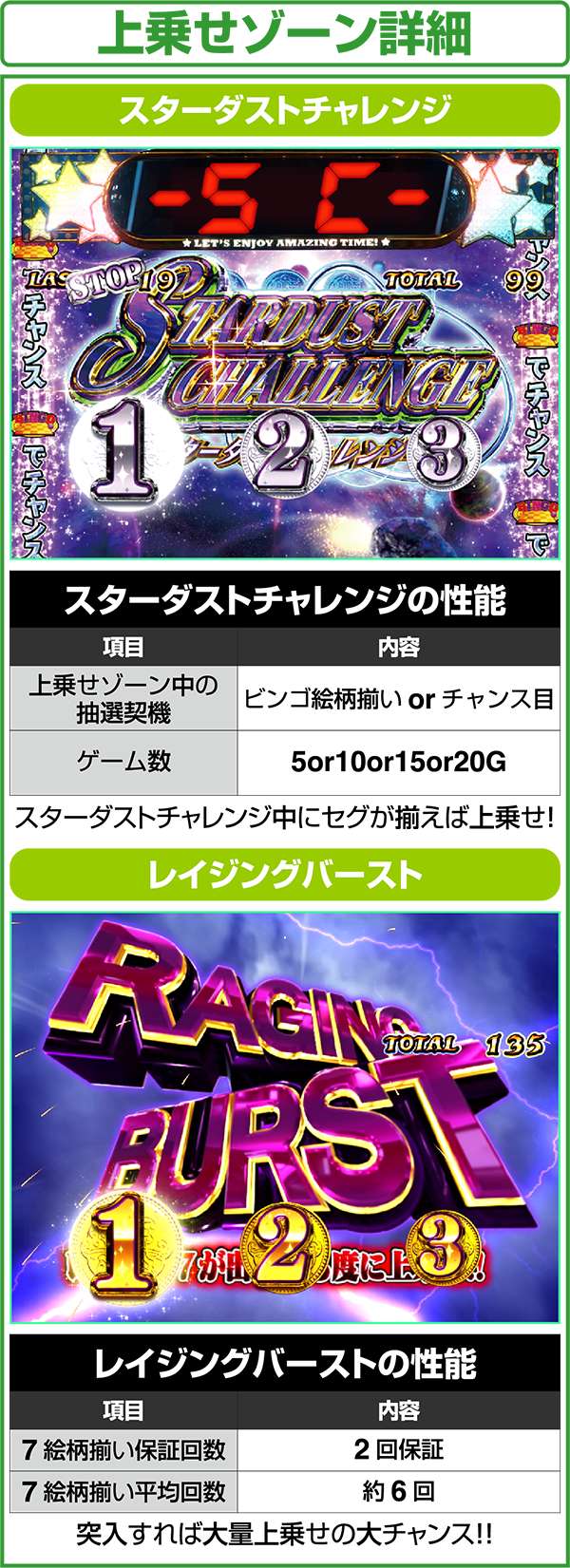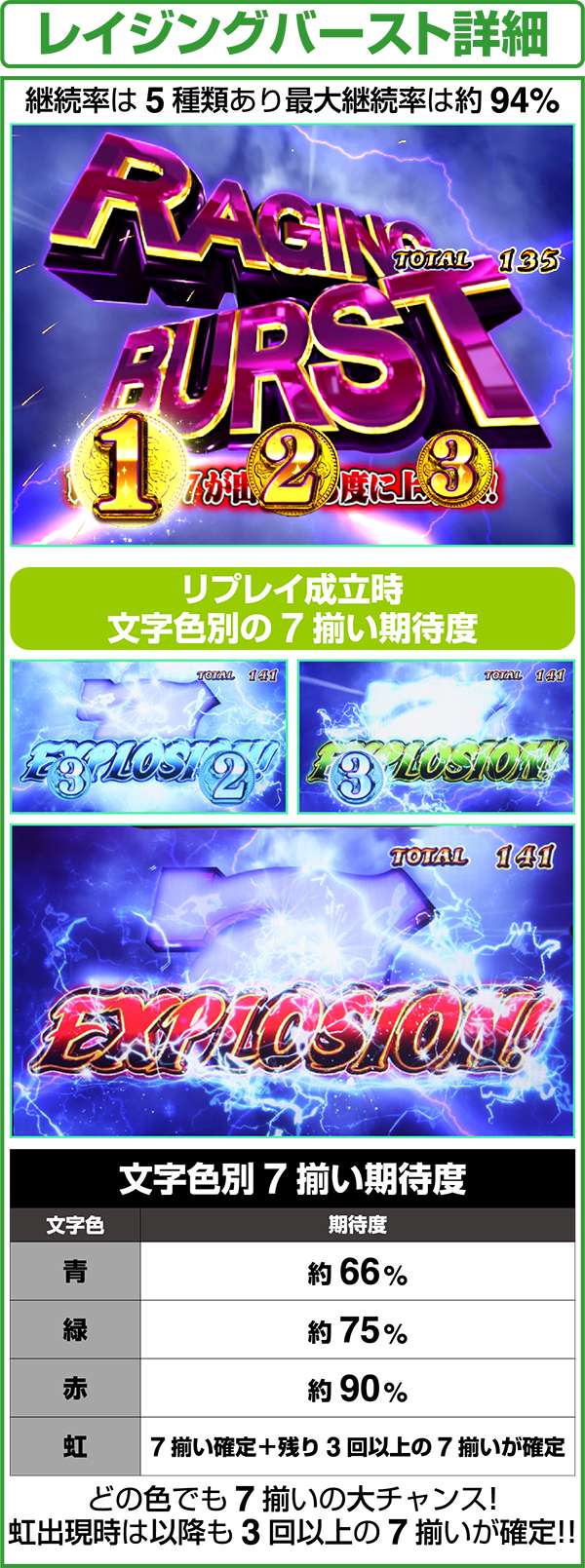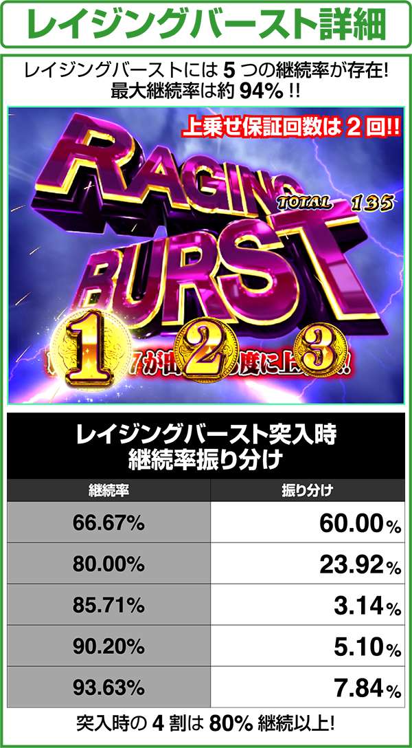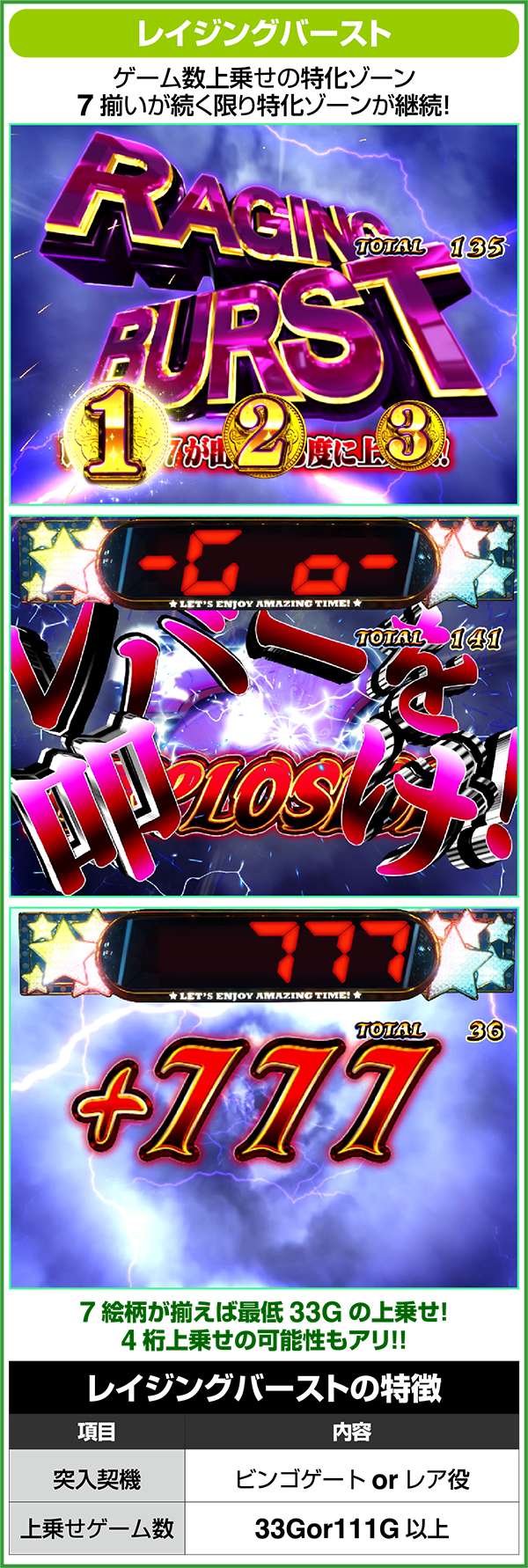 レイジングバーストは最強の上乗せ特化ゾーンで、7が揃う限り継続。4桁上乗せも可能となる強力な特化ゾーンとなる。