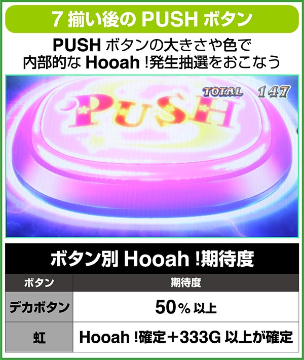 ゲーム数を告知する時は、+33GorHooah!となる。PUSHボタンを押した時に+33G以外なら、Hooah!抽選に当選していることになり、+111G以上が獲得できる。虹ボタン出現時は+333G以上が確定する。
