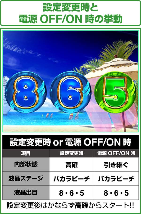 設定変更時は高確スタート、電源OFF/ON時は引き継ぎ。