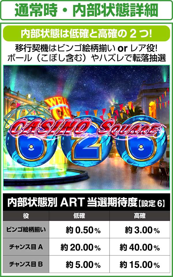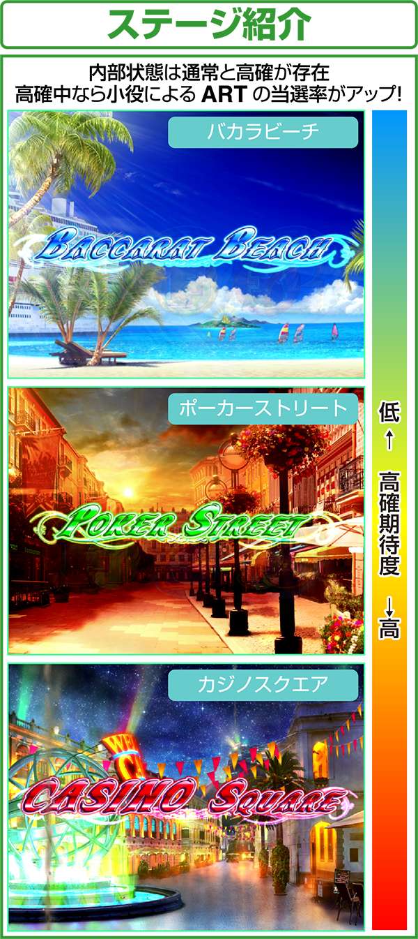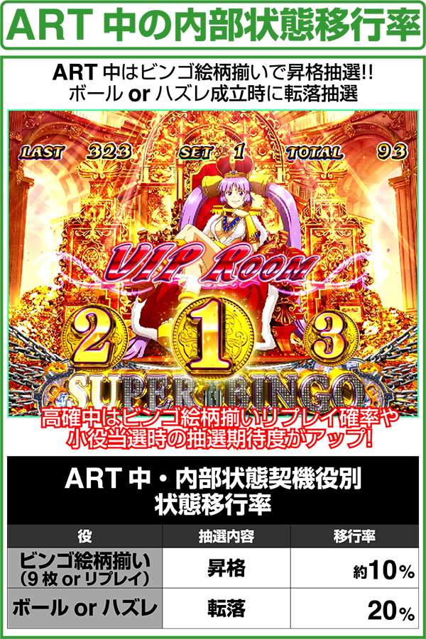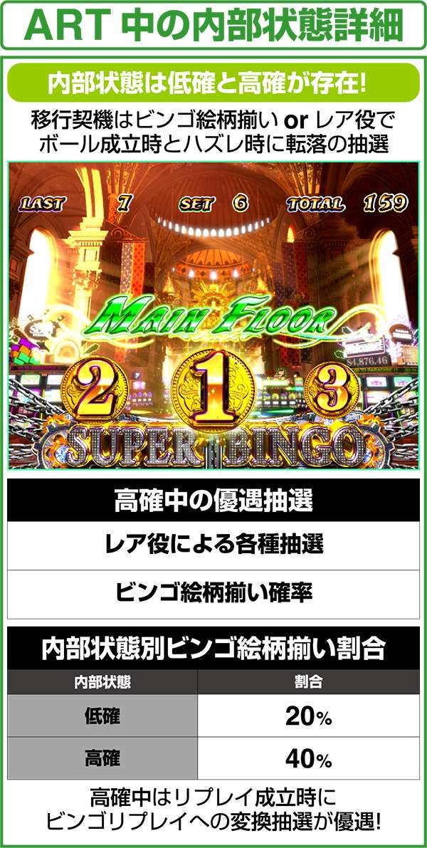 内部状態は低確と高確の2種類。高確中はARTの当選が優遇されている。滞在ステージだけではなく、液晶の左図柄でも高確滞在を示唆しており、青<緑<赤の順にチャンスとなっている。ちなみに、高確の保証ゲーム数はなく、ボール成立時やハズレ時に転落抽選をおこなっている。