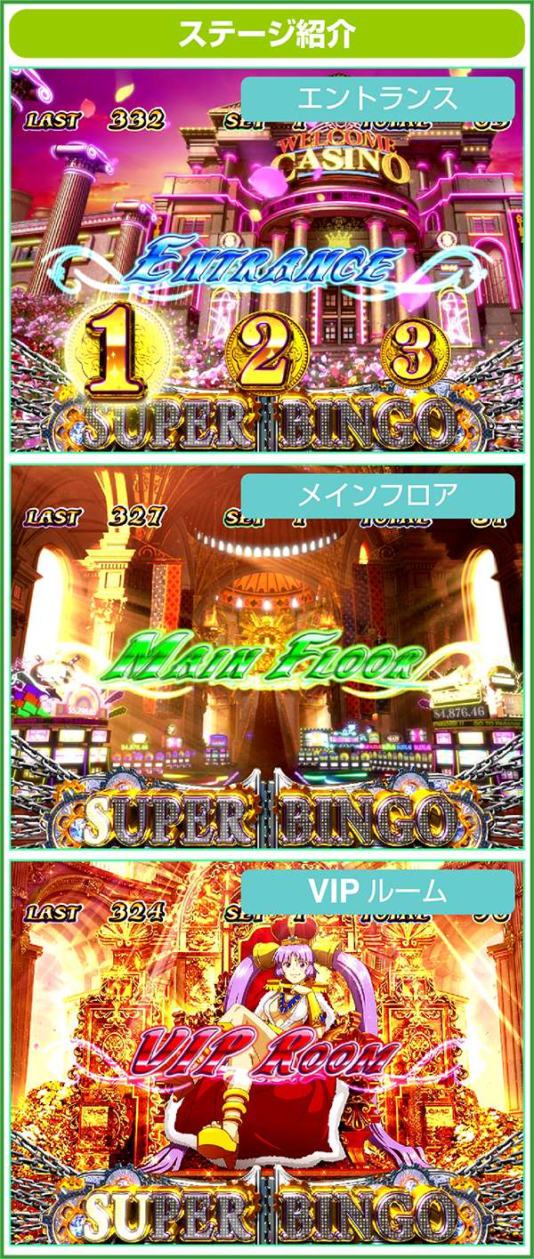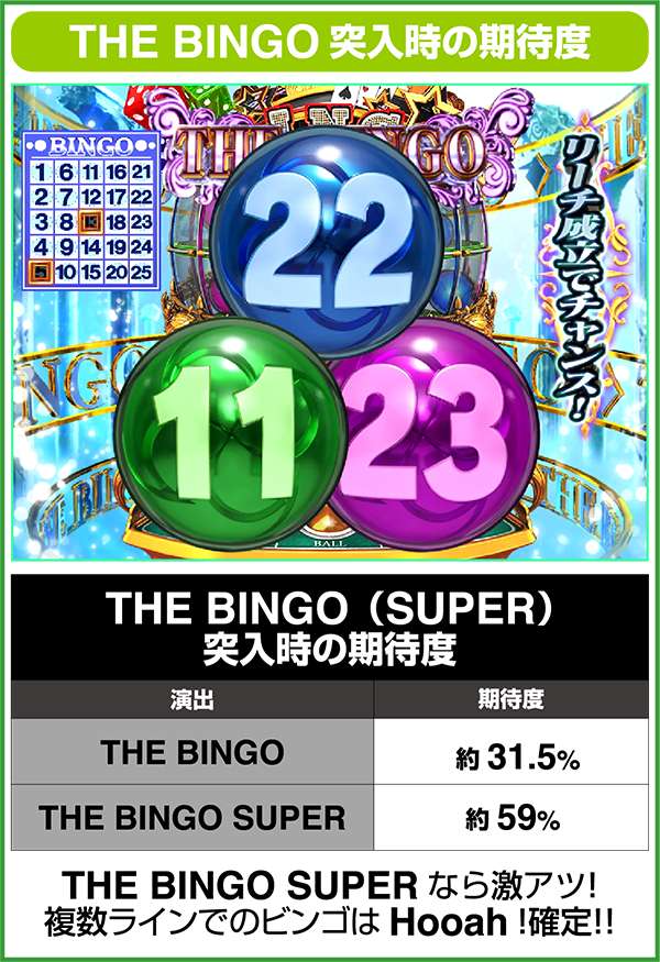 強烈なインパクトで常に注目を集めているビンゴシリーズの最新作「スーパービンゴリゾート」が登場。 純増約2.0枚/GのART「ビンゴチャンス」が出玉増加の肝となり、ARTの当選ルートは前兆経由からのルートとボーナス中の抽選の2パターン。ボーナスはリアルボーナスだけに、どのタイミングでも当選に期待が持てる。もちろん、大量出玉のトリガーとして「Hooah!」も搭載されている。 |
