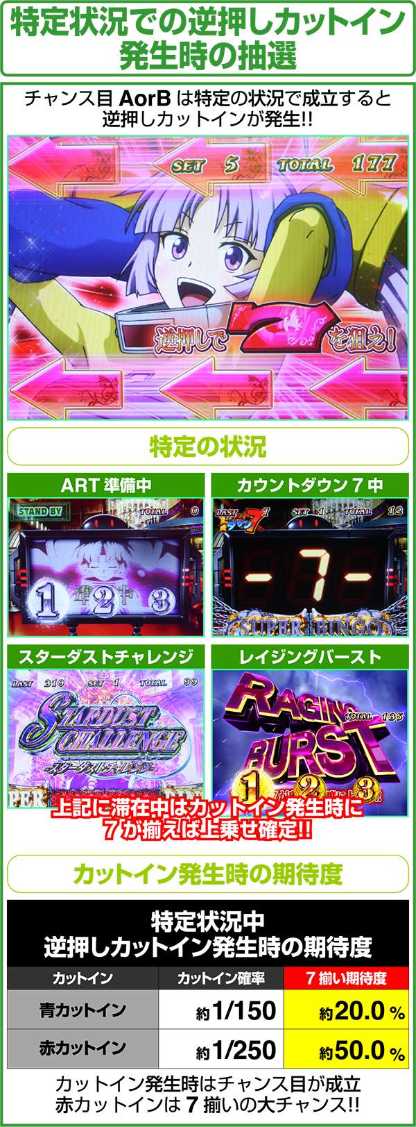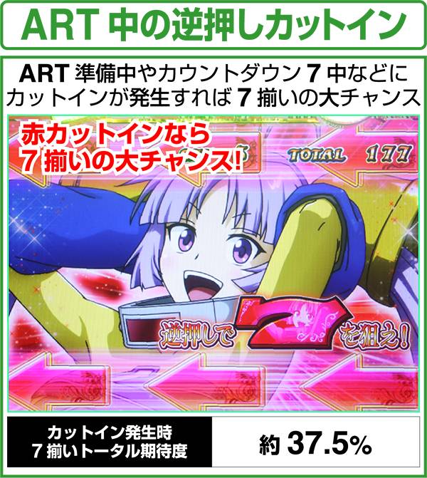 ART準備中とカウントダウン7中、スターダストチャレンジ中の3つの状況でチャンス目が成立した場合は、逆押しカットインが発生。7が揃えば上乗せが確定する。