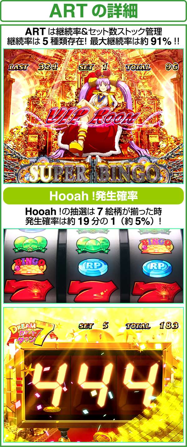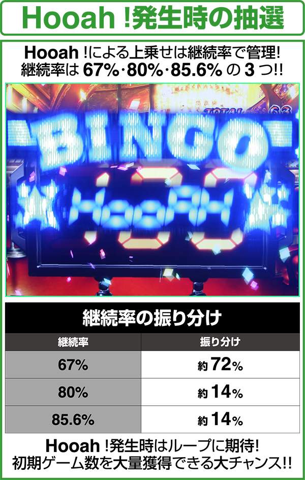7絵柄が揃った時にHooah!の抽選をおこなっているため、初当り時やカウントダウン7中の7絵柄揃いなど、すべての7絵柄揃い時にHooah!発生に期待できる。