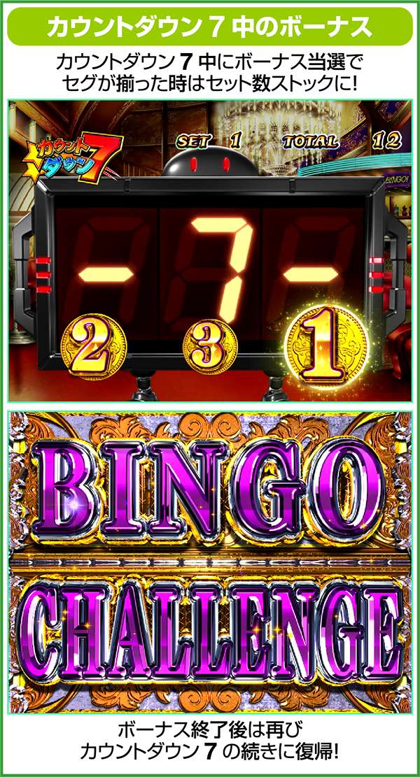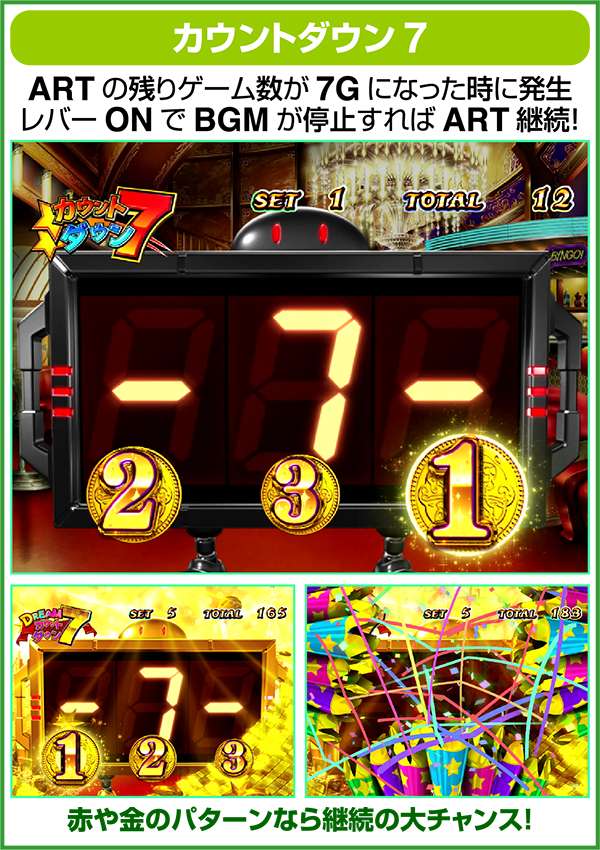 カウントダウン7は7G間継続し、レバーON時にBGMが停止すればARTが継続。7G間でBGMが停止しなくても、リザルト画面表示後に復活する可能性がある。また、残りゲーム数を表示しているナナセGが赤や金ならART継続の大チャンスとなる。