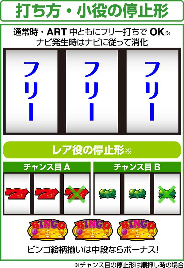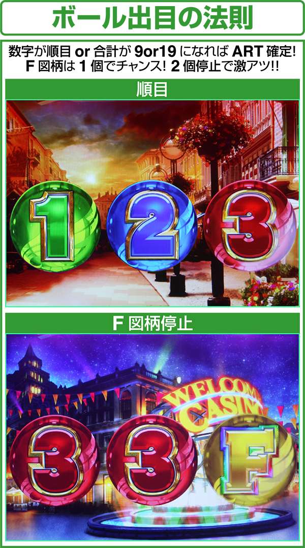 停止した時に左から「1・2・3」といった順目やボールの数字を足した合計が9or19(カブ)になればARTが確定する。また、F図柄は停止するだけでチャンスとなり、2個停止すれば激アツとなる。