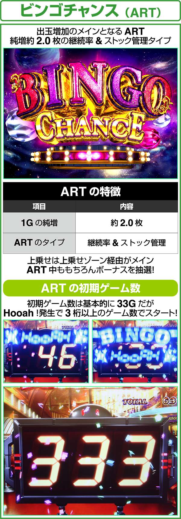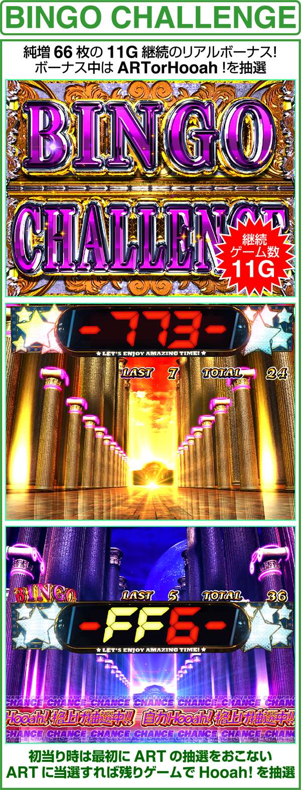 中段ビンゴ絵柄揃いから突入するボーナスで、消化中は毎ゲームビンゴ絵柄(9枚)が揃い、ARTが抽選される。さらに、初当り時のみART当選後はHooah!への格上げ抽選がおこなわれている。