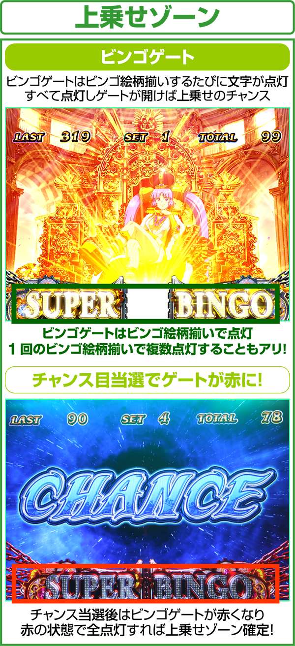 液晶下部のビンゴゲートはビンゴ絵柄が揃うたびに点灯していき、全点灯すれば特化ゾーン獲得のチャンスとなる。