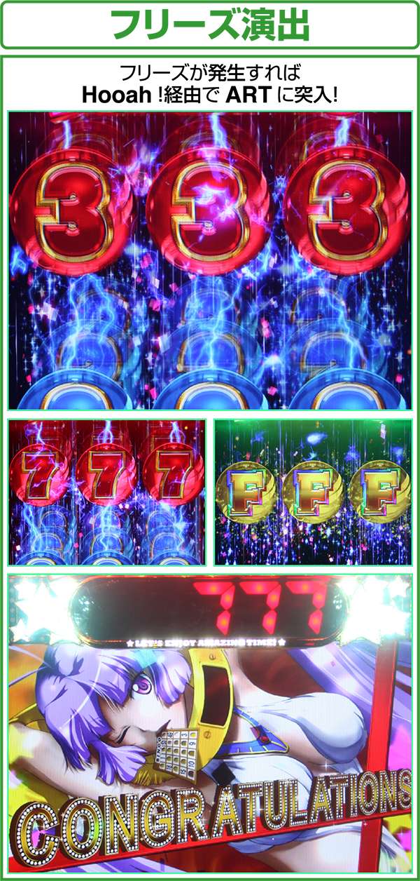 レバーON時に発生し、液晶の図柄が全回転しながら最終的にF絵柄揃いで停止。フリーズ発生後はART突入時に必ずHooah!が発生するため、ARTがロング継続する大チャンスとなる。