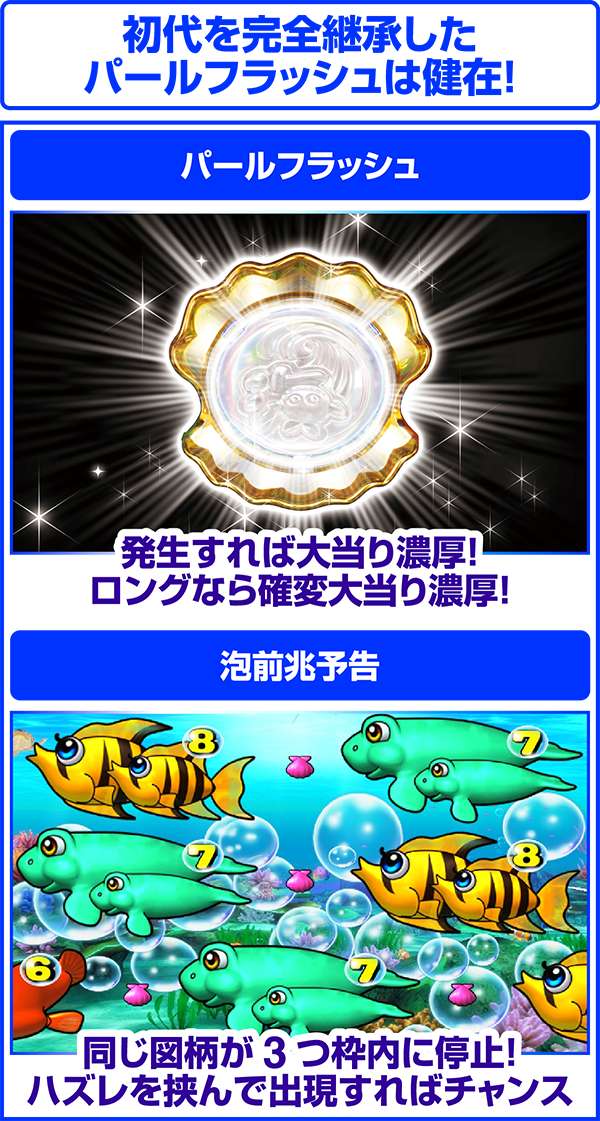 初代を完全継承したパールフラッシュはキュインと光輝けば大当り濃厚! キュキュキュキューンと鳴る長いロングパターンなら確変大当りまで濃厚だ!