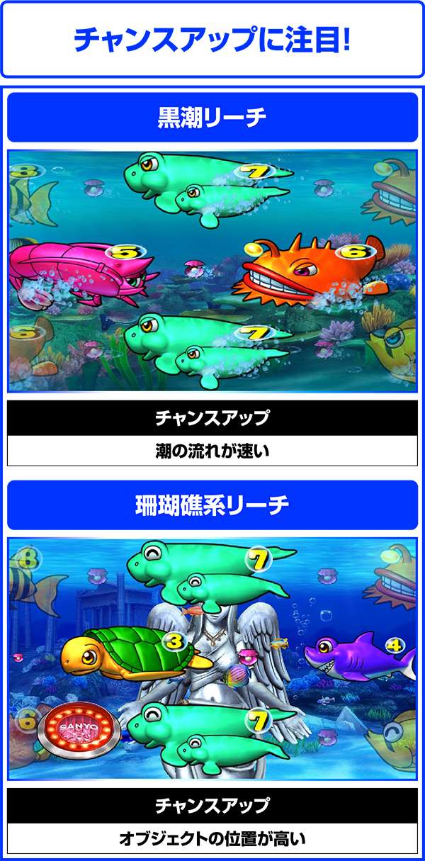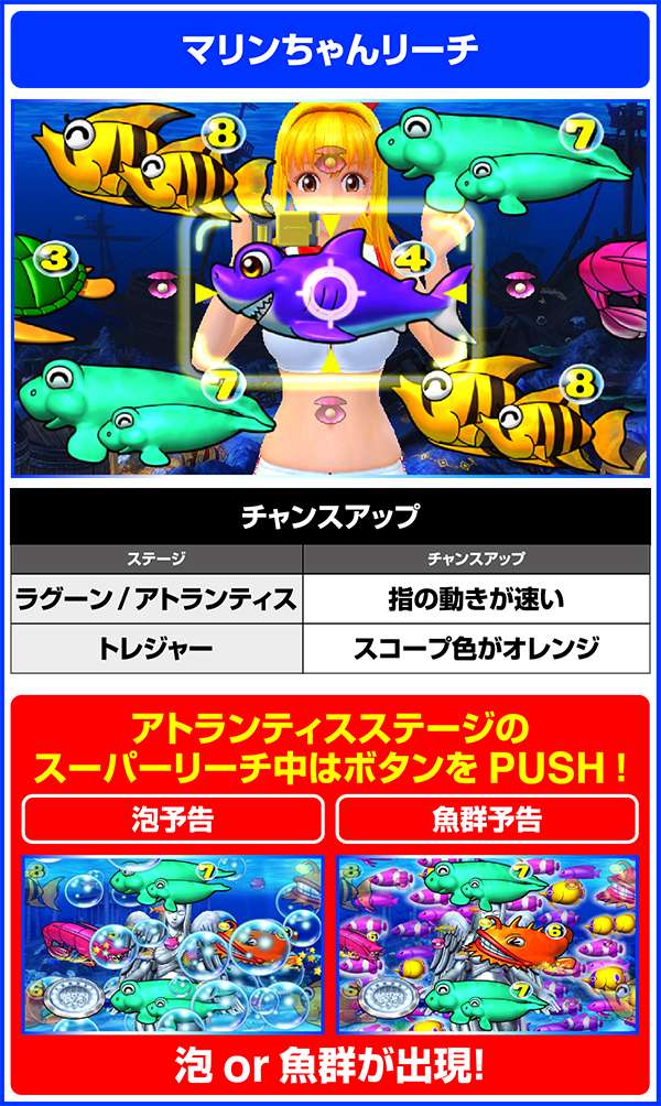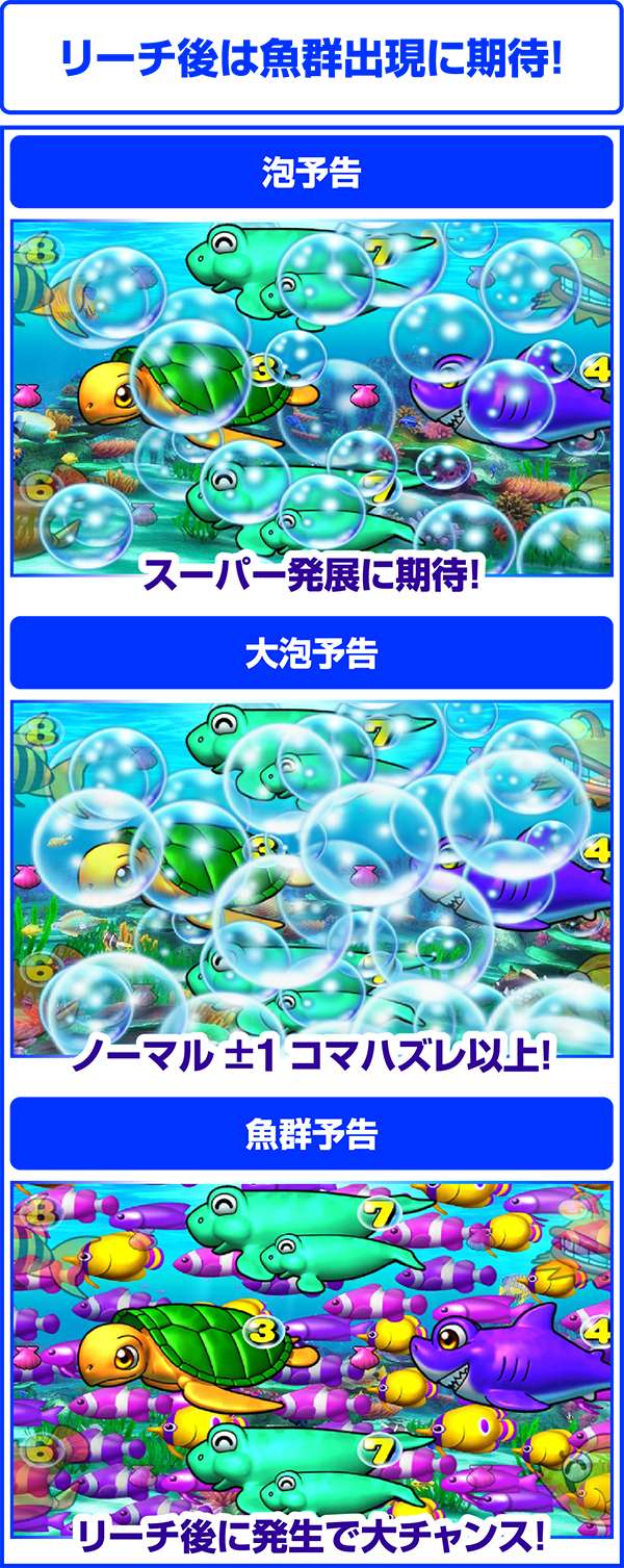 リーチ後に発生する予告が重要で泡ならチャンスとなり、魚群なら大チャンス!