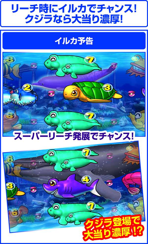 リーチ時にイルカが登場すればスーパーリーチ発展のチャンス。イルカの代わりにクジラが登場すれば大当り濃厚!?