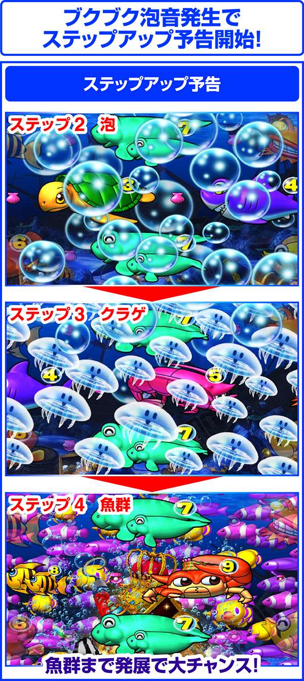 ブクブク音から始まるステップアップ予告は、魚群発生となるステップ4で大チャンス!