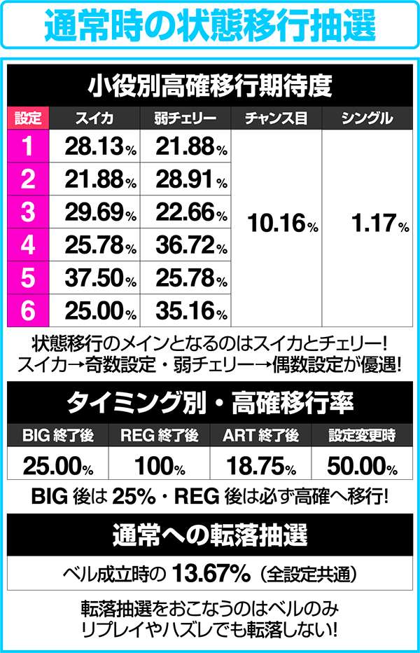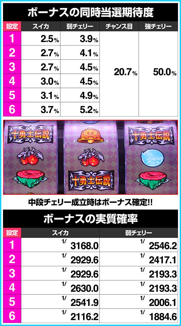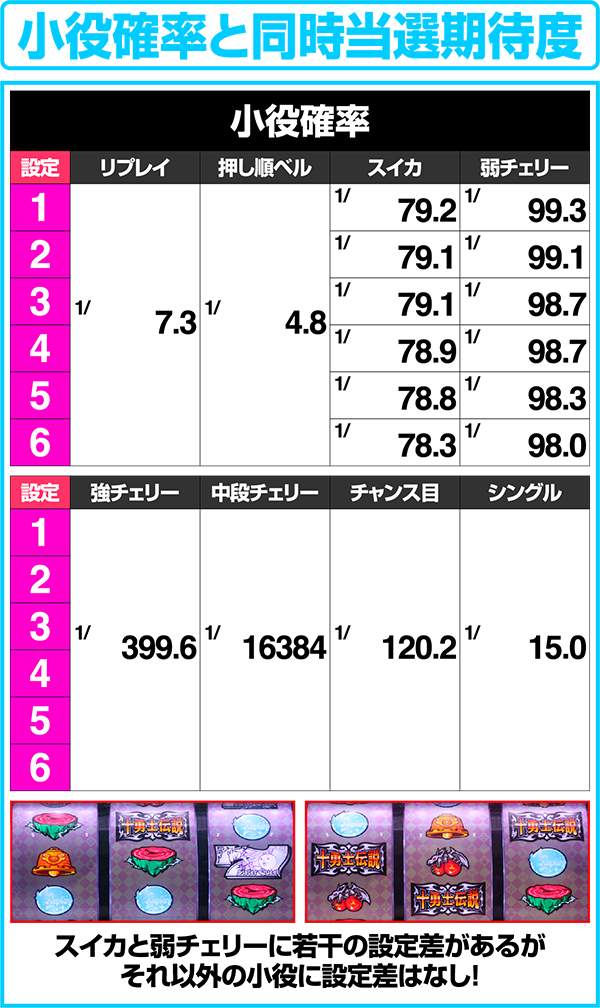 小役の確率とボーナスの同時当選期待度は設定共通のものが多いが、スイカと弱チェリーはどちらも高設定ほど出現しやすくボーナスの同時当選期待度も高いため、ボーナスの実質確率に大きな差が出ている。