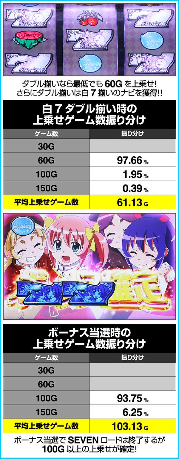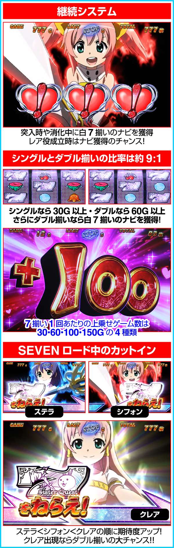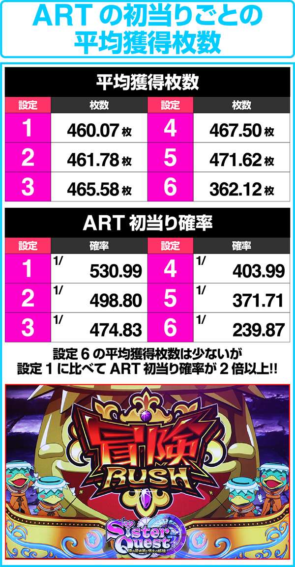 シスタークエストの最新作がボーナス+ART機として登場。 ボーナスはストーリーボーナスと練金チャンスの2種類があり、獲得枚数はストーリーボーナスが約204枚、練金チャンスが約54枚。1Gあたりの純増が約1.4枚となるART「冒険RUSH」は、1セット40or100G+継続バトルとなっている。 ほかにも、プレミアムボーナスや最強特化ゾーンであるMIRACLEロードなど強力な出玉のトリガーは多彩だ。 |